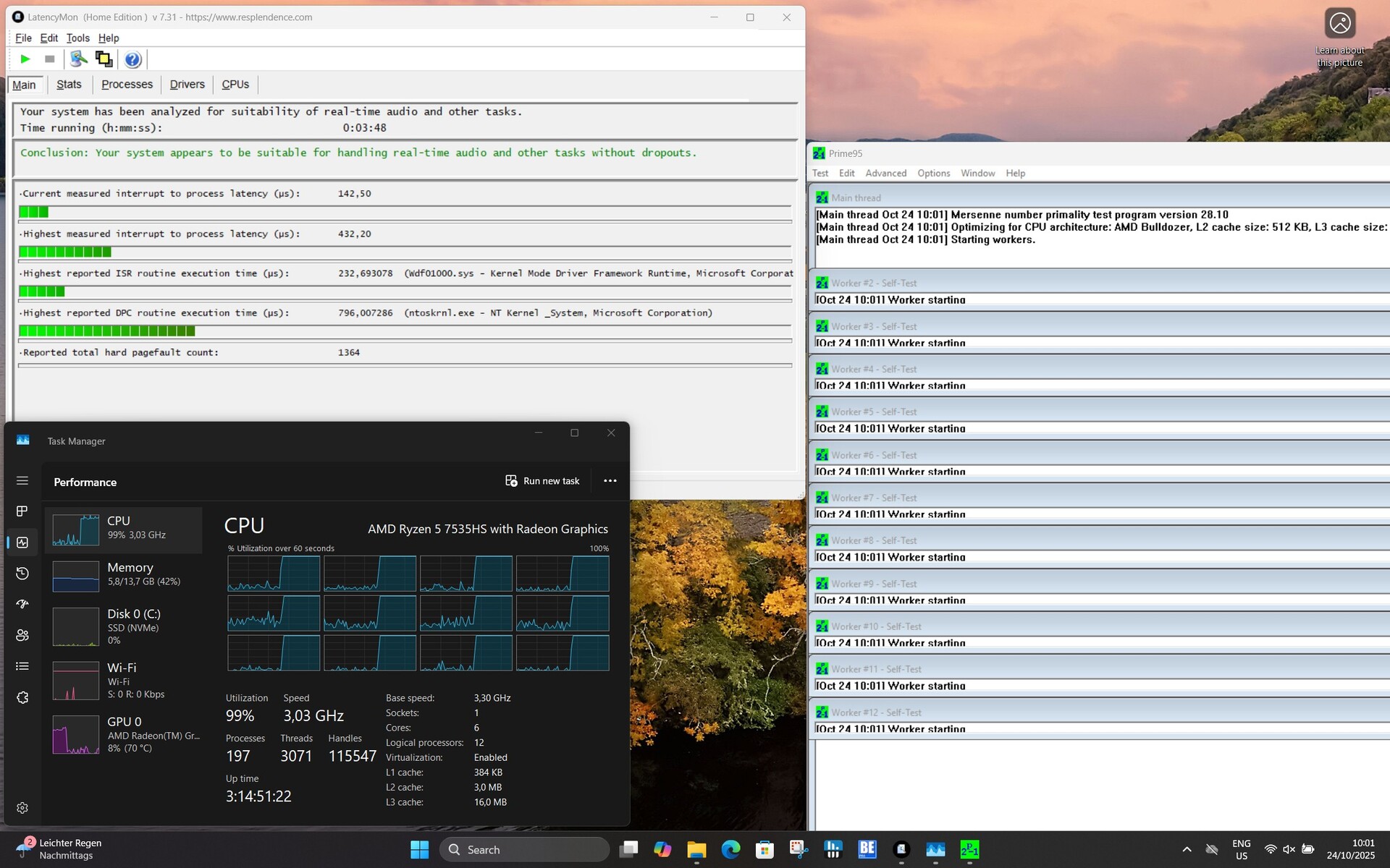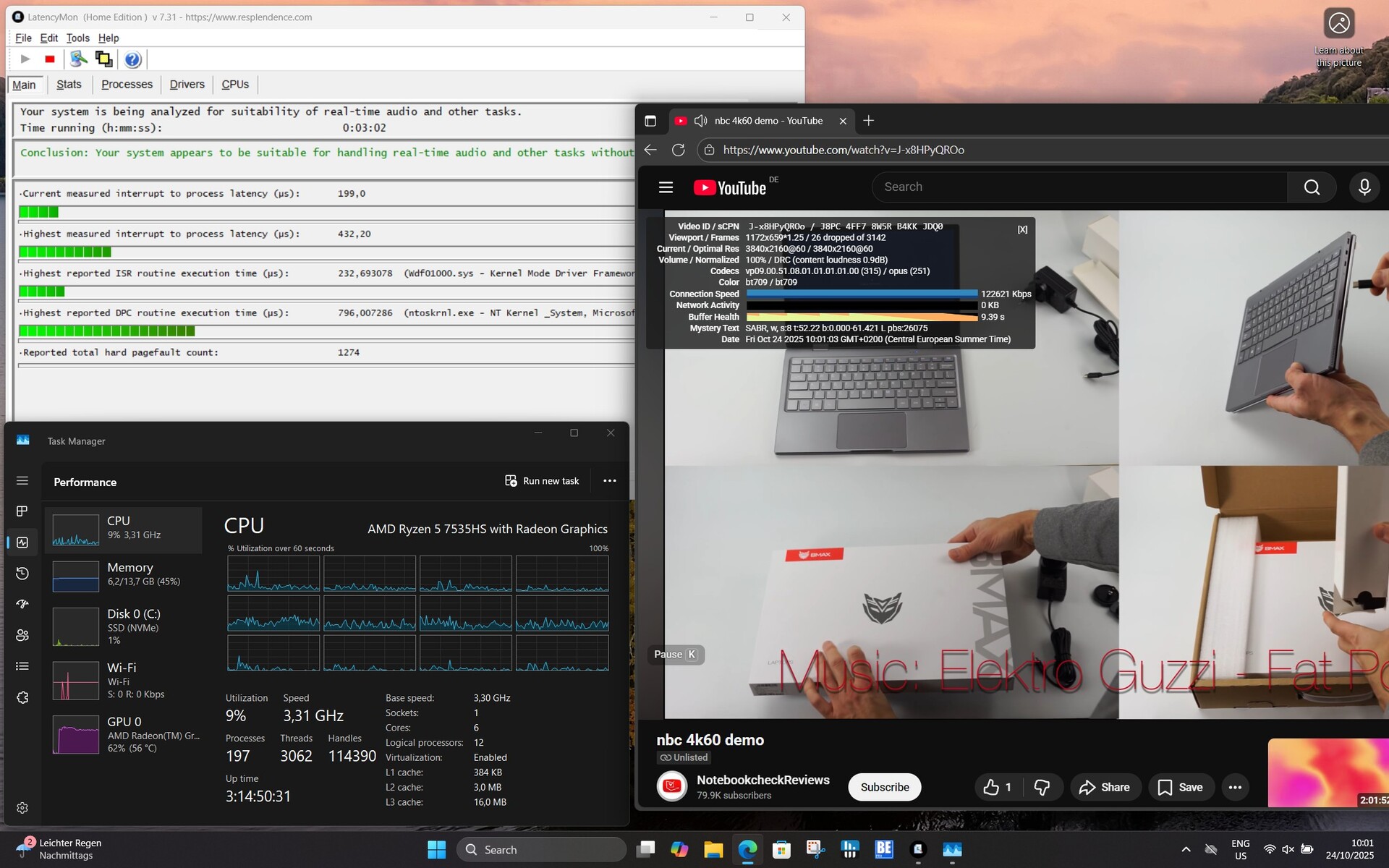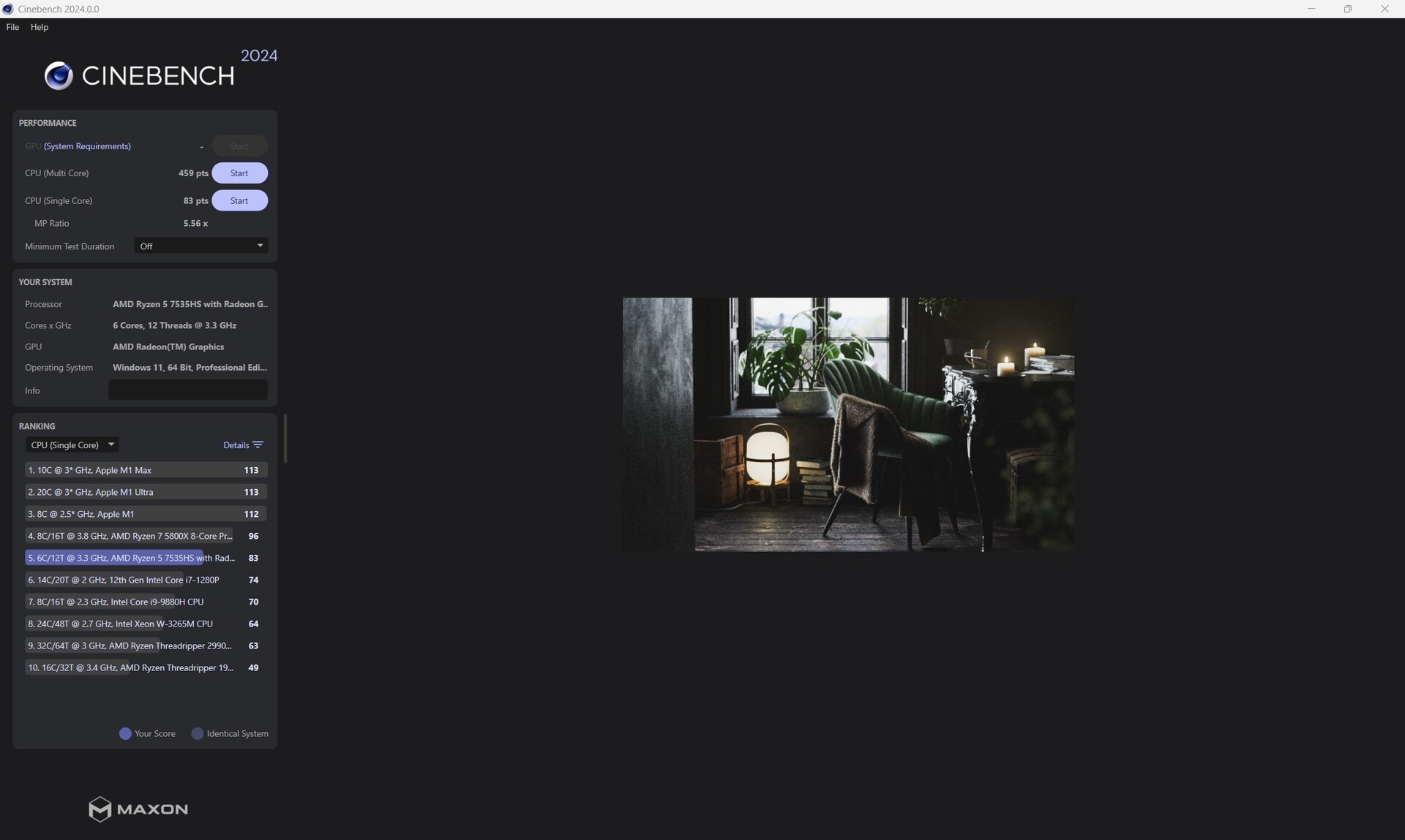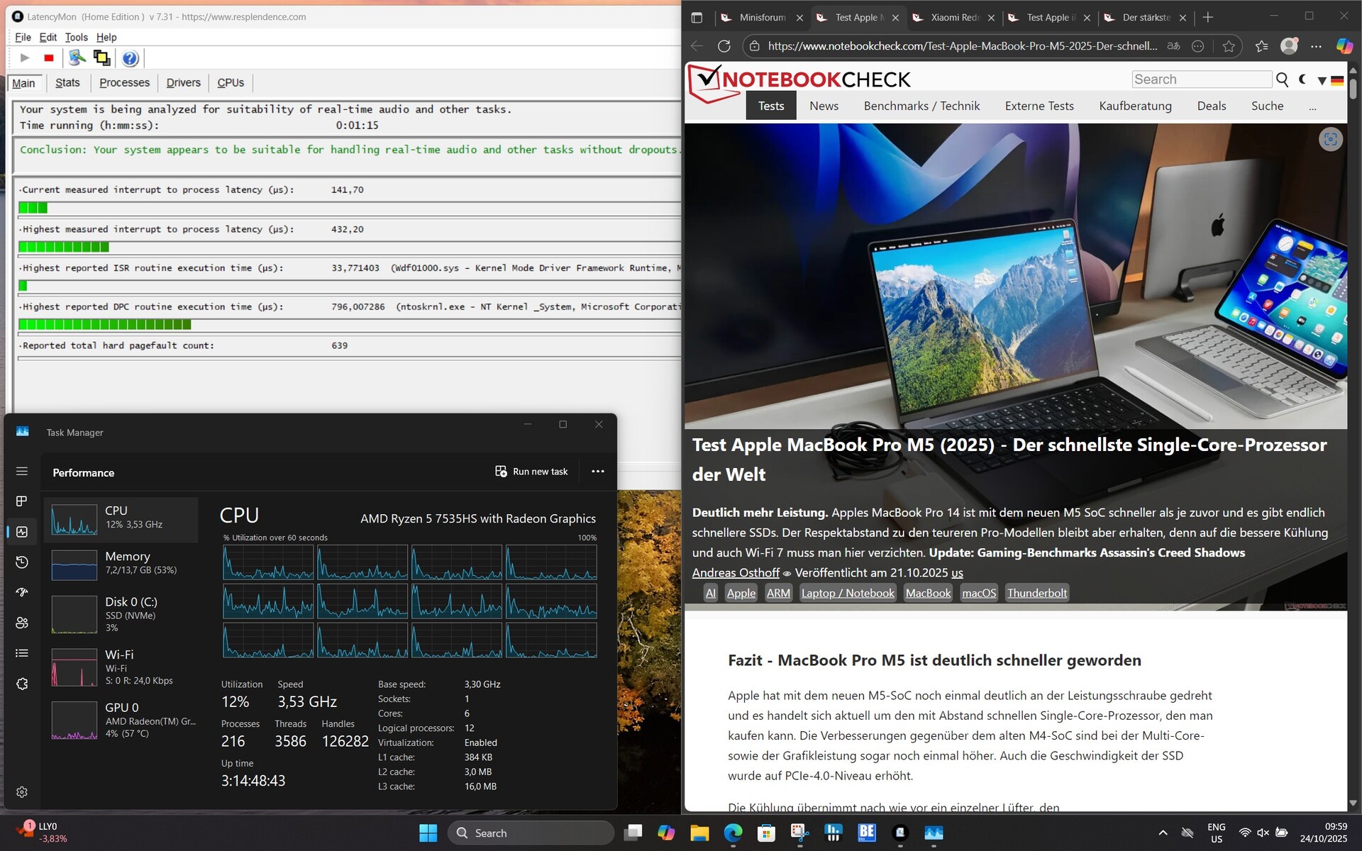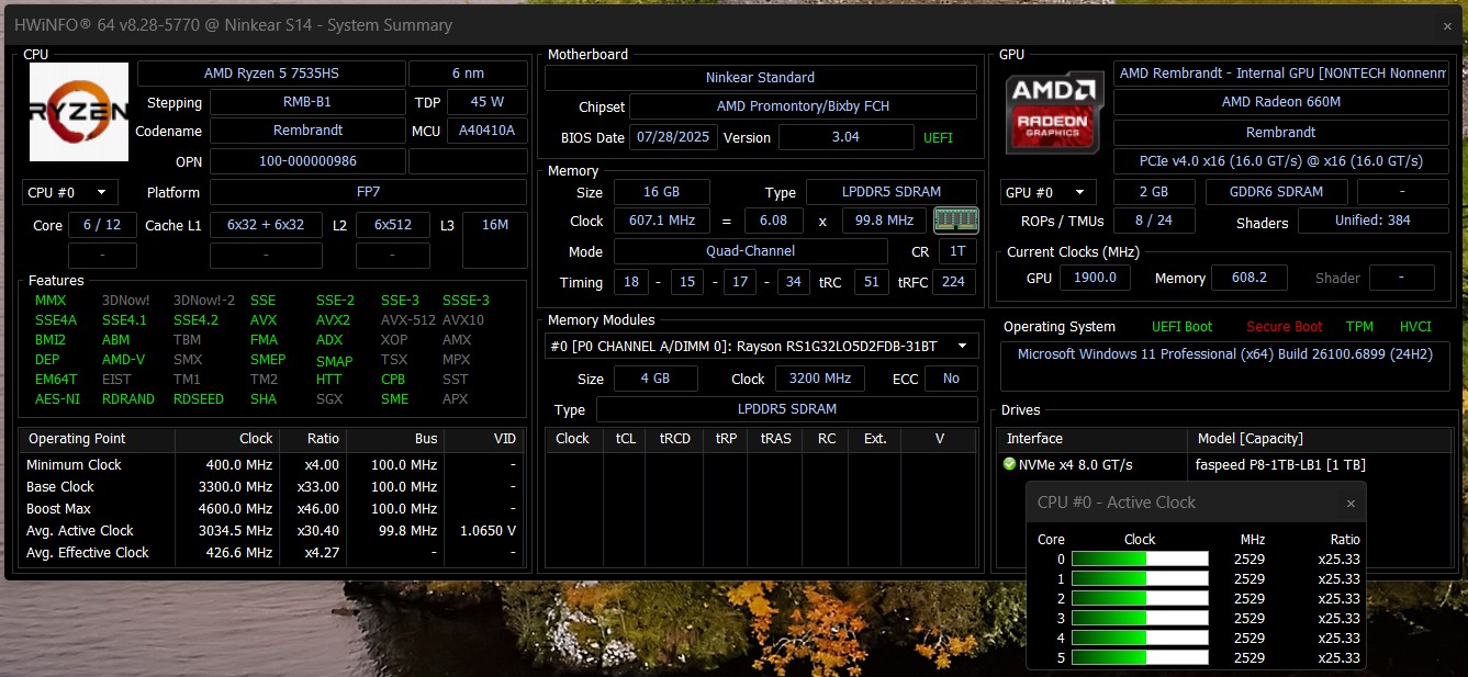 В Ninkear S14 используется AMD Ryzen 5 7535HS, мощный шестиядерный процессор с двенадцатью потоками, тактовая частота которого достигает 4,55 ГГц. Поэтому процессор обеспечивает достаточную производительность для типичных офисных приложений, мультимедиа и легкой многозадачности. Однако при постоянной полной нагрузке производительность несколько ограничена предельной мощностью системы, что приводит к небольшому снижению производительности по сравнению с более мощными устройствами.
