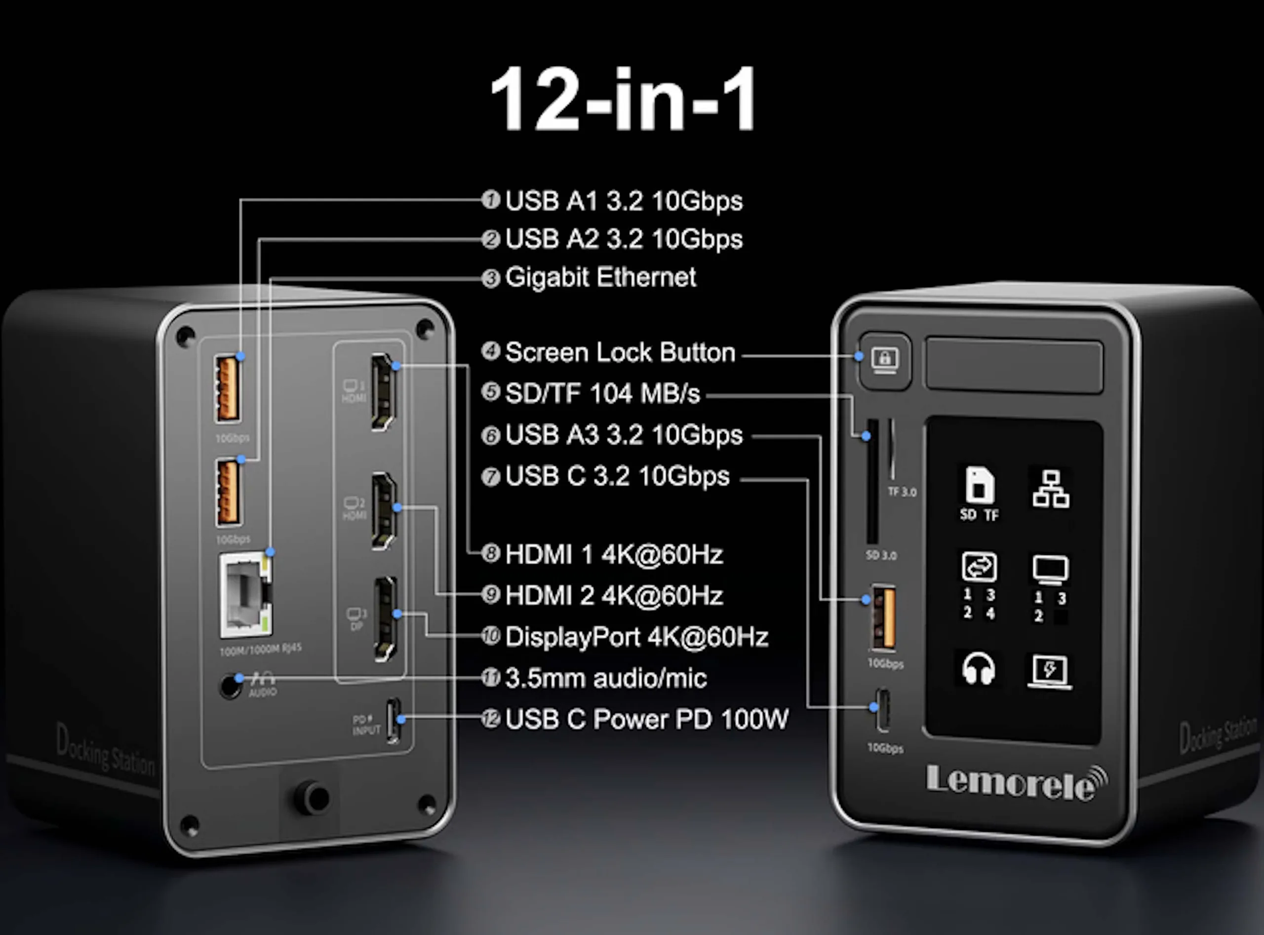 Док-станция, продаваемая под названием TC1000, рекламируется как система "12 в 1", имеет размеры 2,6 x 2,6 x 4,2 дюйма и поддерживает одновременное использование до трех дисплеев, хотя устройство-источник также должно быть на это способно. Имеется два порта HDMI и один DisplayPort, каждый из которых поддерживает разрешение 4K при 60 Гц. На передней панели расположен дисплей, хотя содержимое, отображаемое на нем, не может быть настроено. По крайней мере, он может показать, используются ли в данный момент определенные порты или нет.