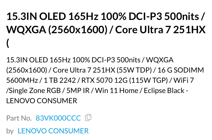 Хотя все это вполне ожидаемо, Amazon также упоминает еще не представленный процессор Core Ultra 7 251HX. Между тем, Cendirect Canada прямо указывает на версию Nvidia GeForce RTX 5070 с 12 ГБ VRAM. Обладая общей графической мощностью (TGP) до 115 Вт, этот еще не представленный GPU похоже, будет запущен в Yoga Pro 7 и ROG Zephyrus G14, а также в других игровых ноутбуках.