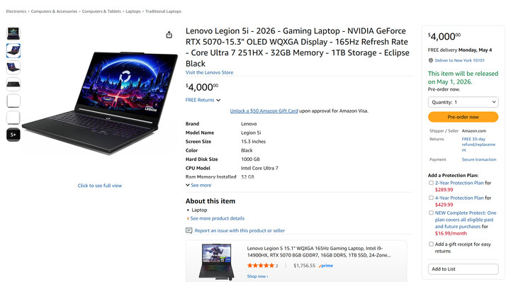 Тем временем пользователь X Huang514613 заметил, что различные версии продаются на Cendirect Canada и Amazon US по цене $4 000. Как показано на изображении ниже, Lenovo включила в список Legion 5i с 15,3-дюймовым OLED-дисплеем, 1 ТБ памяти и 32 ГБ оперативной памяти в отделке Eclipse Black. Другими словами, это соответствует аппаратному обеспечению существующих вариантов Panther Lake.