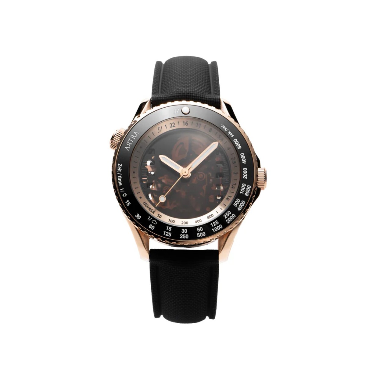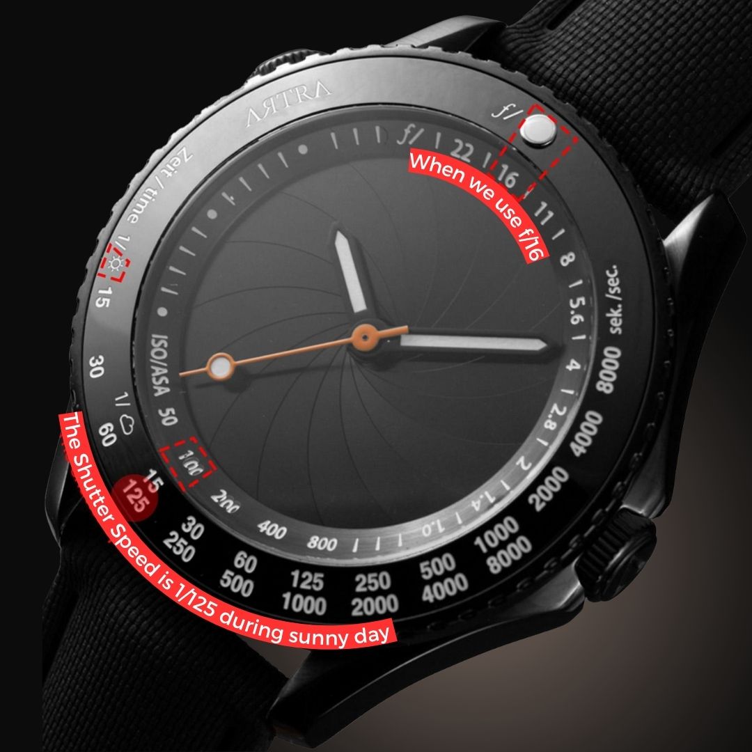 Эти элементы не только служат декоративной цели, но и позволяют пользователю рассчитать правильную выдержку для правильной экспозиции. Например, читая ободок изнутри, можно увидеть, что при ISO 400 и f/16 правильная выдержка составляет 1/500 с при солнечном свете и 1/60 с в тени. Выбранную диафрагму можно отрегулировать, вращая безель. Корпус часов выполнен из нержавеющей стали и водонепроницаем до 50 метров, а циферблат защищен сапфировым стеклом