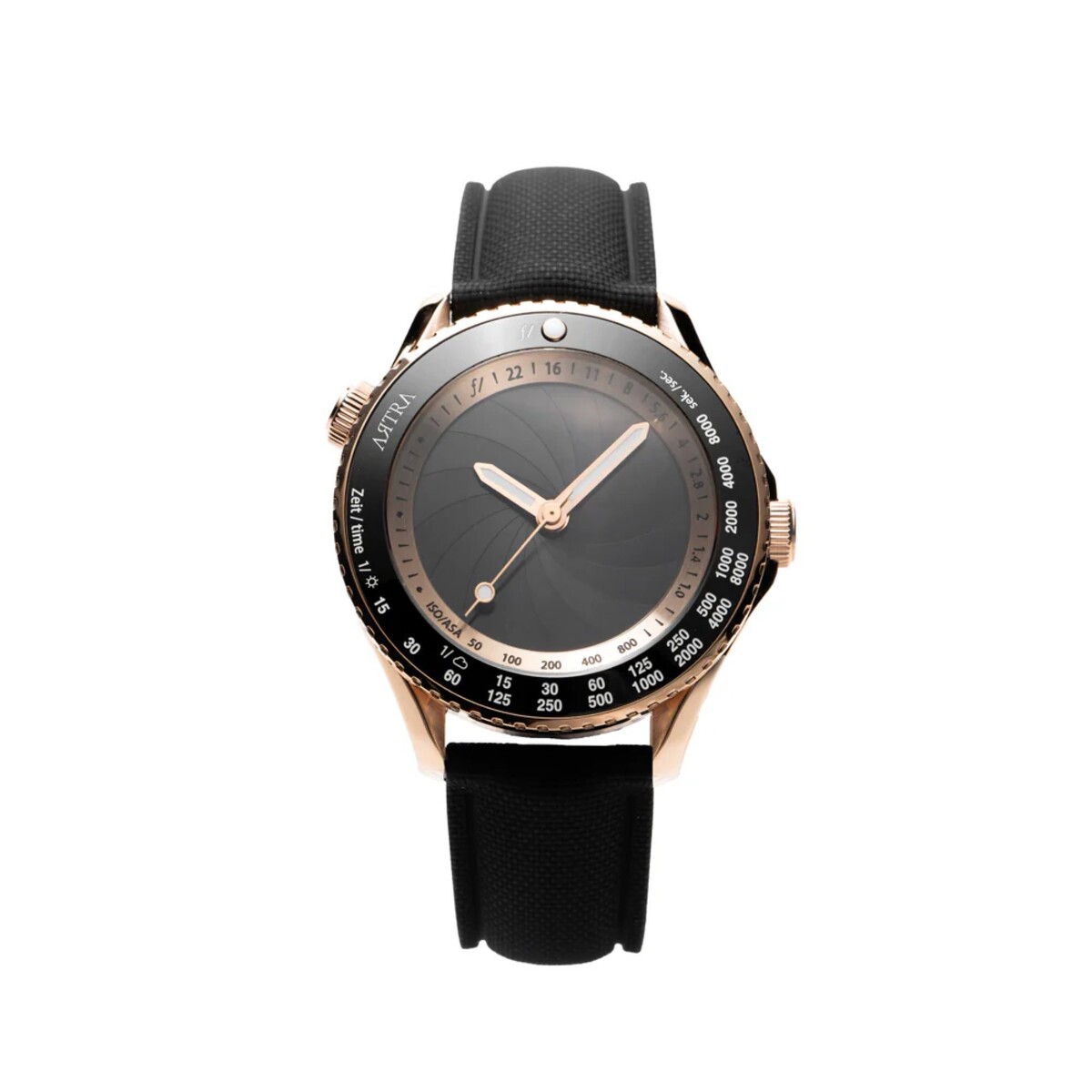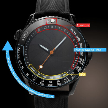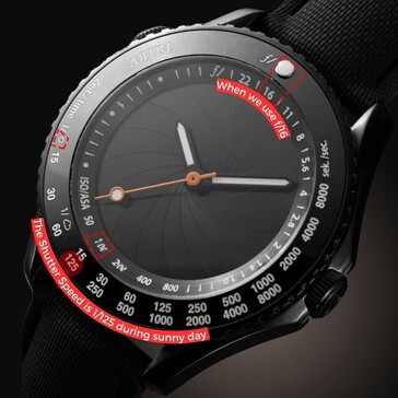 Когда апертура открывается, открывается частично прозрачный циферблат, по дизайну напоминающий 35-миллиметровую пленку. Прозрачность позволяет рассмотреть находящийся внутри механизм, а окно на задней крышке часов обеспечивает лучший обзор механизма. На левой стороне корпуса указаны значения диафрагмы от f/1.0 до f/16, а на безель нанесены цифры, обозначающие выдержку и ISO пленки.