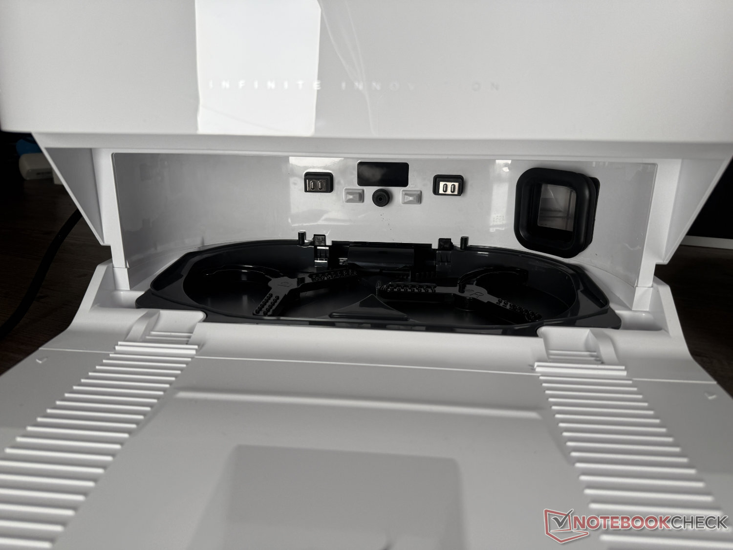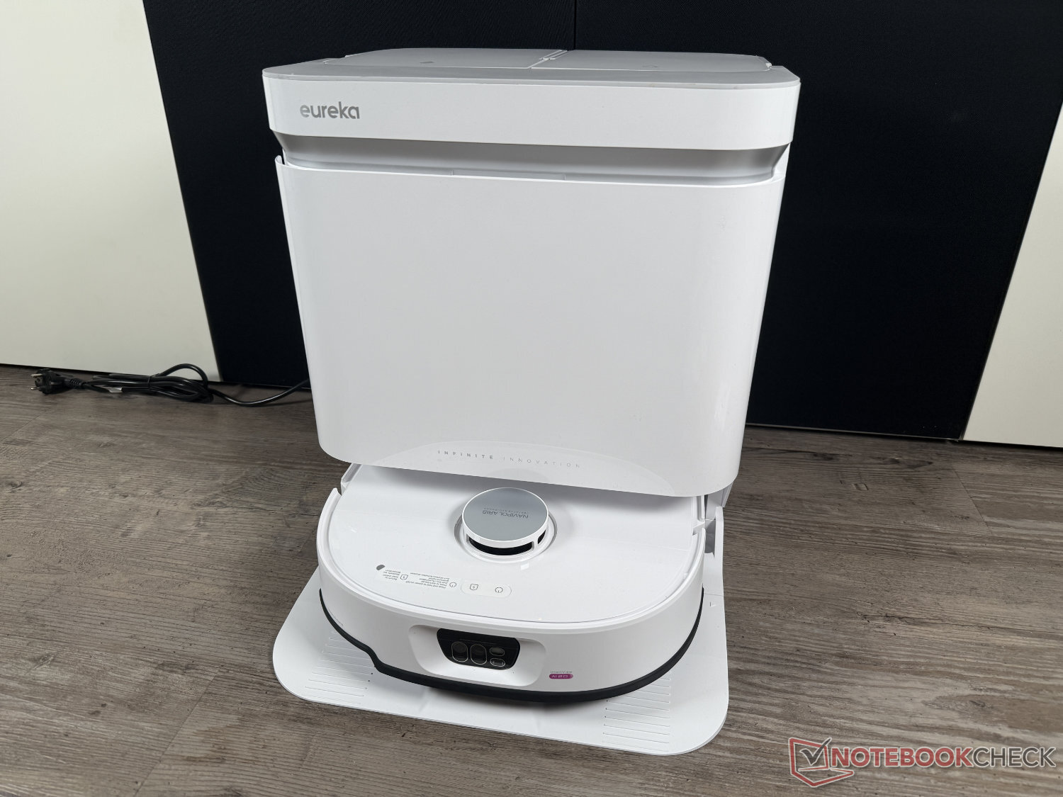 Eureka J15 Max Ultra поставляется со станцией самоочистки. Кроме того - если не считать отсутствия автоматического дозирования моющего средства - швабры очищаются, как обычно, водой, нагретой до 80°C, а затем сушатся воздухом, нагретым до 55°C. Визуально база имеет довольно простой и привлекательный дизайн. Несколько портит впечатление то, что у белой версии черный кабель питания.