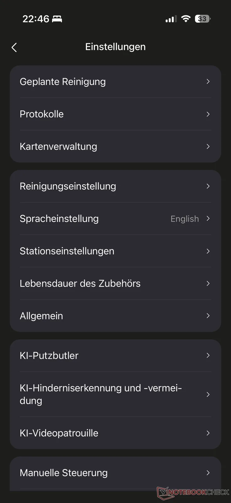 Многочисленные опции настройки появляются в меню в правом верхнем углу. Помимо расписания и протоколов уборки, здесь есть обычные и важные опции настройки уборки (включая индивидуальные настройки для отдельных ковров), обнаружения препятствий ИИ, станции и многое другое. Нас раздражал тот факт, что доступ к прямой трансляции видео работает без предварительной активации, включая код безопасности. Нам также не хватало голосового управления. Есть только немецкая голосовая обратная связь.