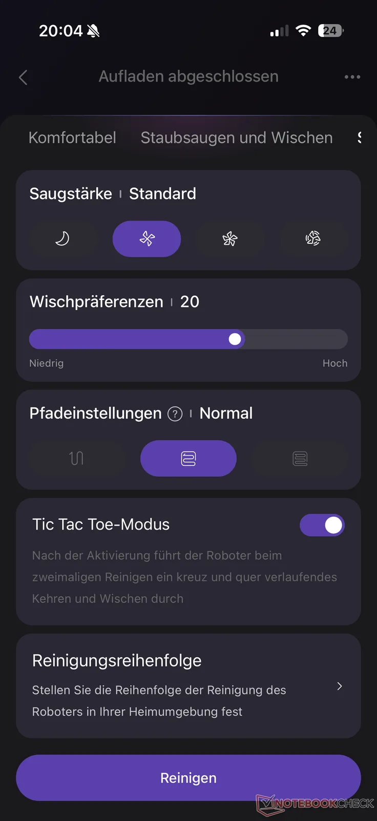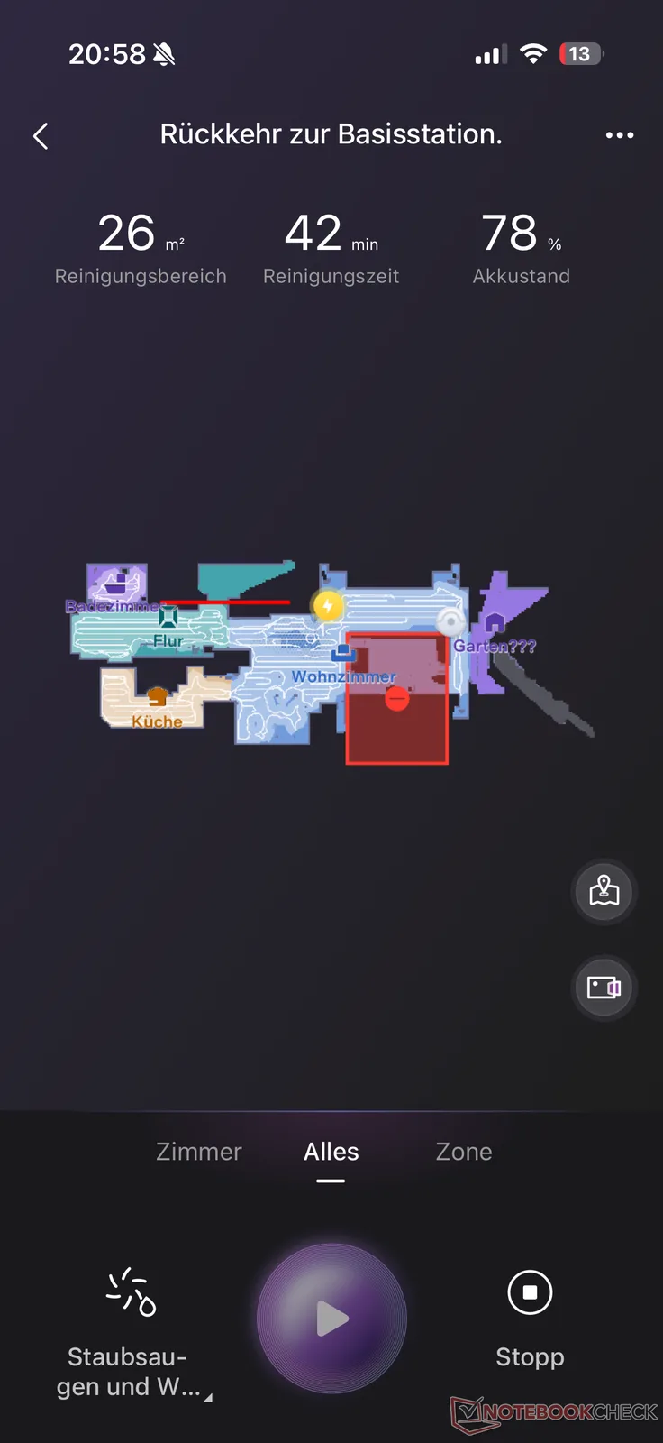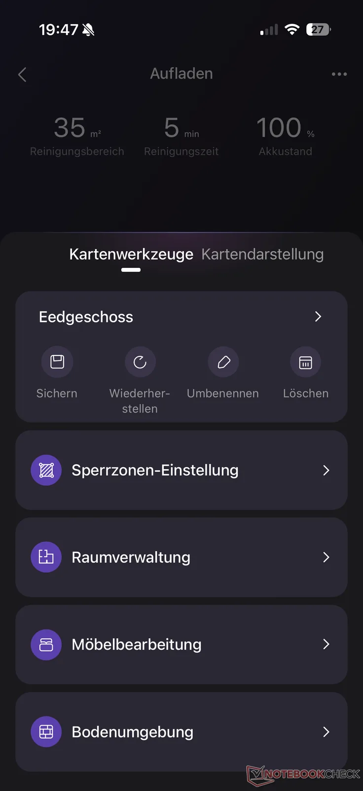 Затем следует обычный для всех роботов-пылесосов запуск картографии. Здесь J15 Max Ultra создает виртуальную карту своей "новой территории" в течение нескольких минут. Автоматическое разделение комнат работает не особенно точно. Среди прочего, окно, закрытое рольставнями, было принято за другую комнату, находящуюся за ним, на основании отражения. Однако большинство неточностей можно скорректировать в соответствии с реальными условиями с помощью управления картой, включая запретные зоны, пороги, напольные покрытия и мебель. В целом, однако, нам больше понравилась настройка карты с помощью одного или другого производителя, в том числе благодаря иногда довольно долгому времени загрузки приложения.