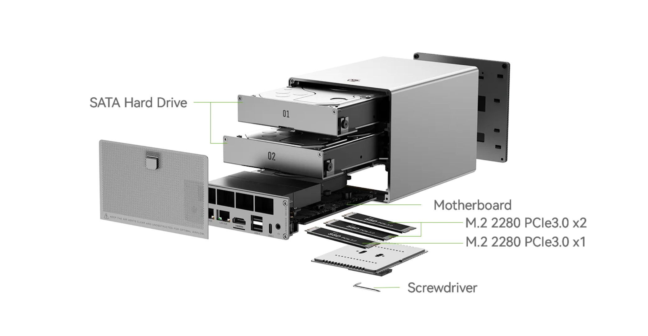 Похоже, что этот включенный накопитель занимает один из трех слотов M.2 2280 в ME Pro. Обратите внимание, что Alder Lake-N и Twin Lake ограничивают пропускную способность SSD до PCIe 3.0 x2 для одного диска (1,97 ГБ/с) и PCIe 3.0 x1 для двух других (2 x 0,98 ГБ/с). Кроме того, Beelink оснастил ME Pro парой слотов для 3,5-дюймовых дисков, что позволило довести общий объем хранения NAS до 72 ТБ при размерах корпуса всего 166 x 121 x 112 мм.