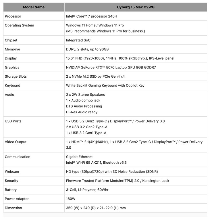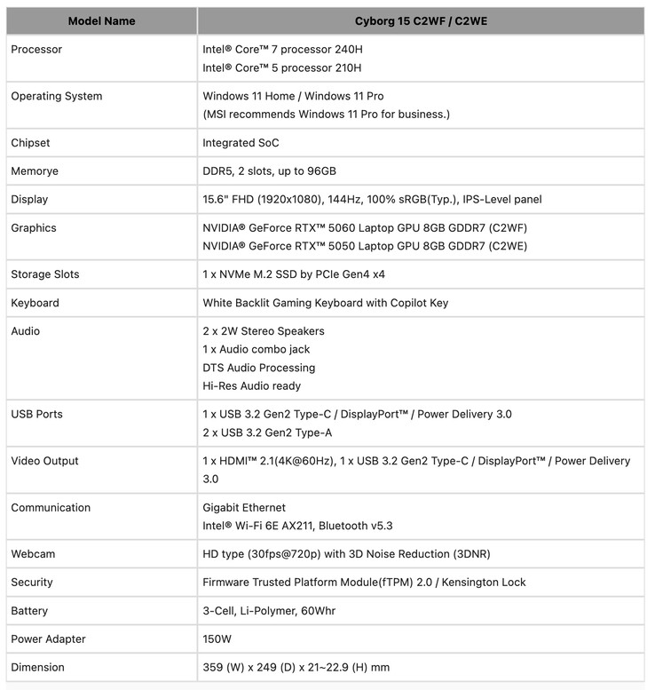 В то же время MSI обновила модель Crosshair 16 HX с вариантами E14WGK, E14WFK и E14WEK, использующими Core i7 14650HX или Core i9-14900HX и 8 ГБ версии GeForce RTX 5050, GeForce RTX 5060 или GeForce RTX 5070. Кроме того, MSI также представила три новых 15-дюймовых ноутбука Cyborg под названиями Cyborg 15 Max, C2WG Cyborg 15 C2WF и Cyborg 15 C2WE с аналогичными прошлогодним моделям техническими характеристиками (по курсу $1 299 на Amazon). Однако MSI пока не подтвердила цены и доступность своих новых моделей. Пожалуйста, ознакомьтесь с пресс-релизом компании https://www.msi.com/news/detail/MSI-Unveils-New-Raider-and-Crosshair-Gaming-Laptops-with-Up-to-300W-Combined-Power--Delivering-Industry-leading-Performance--148460 для получения более подробной информации.