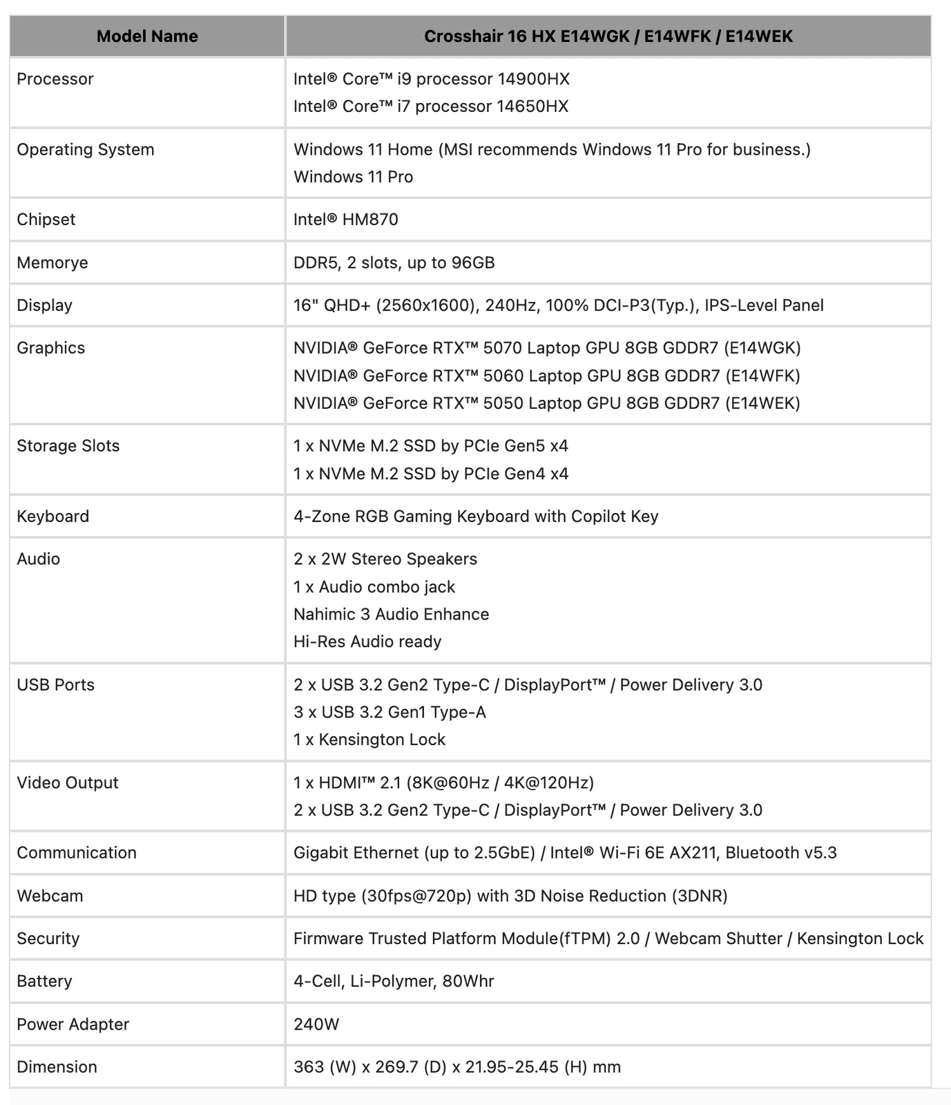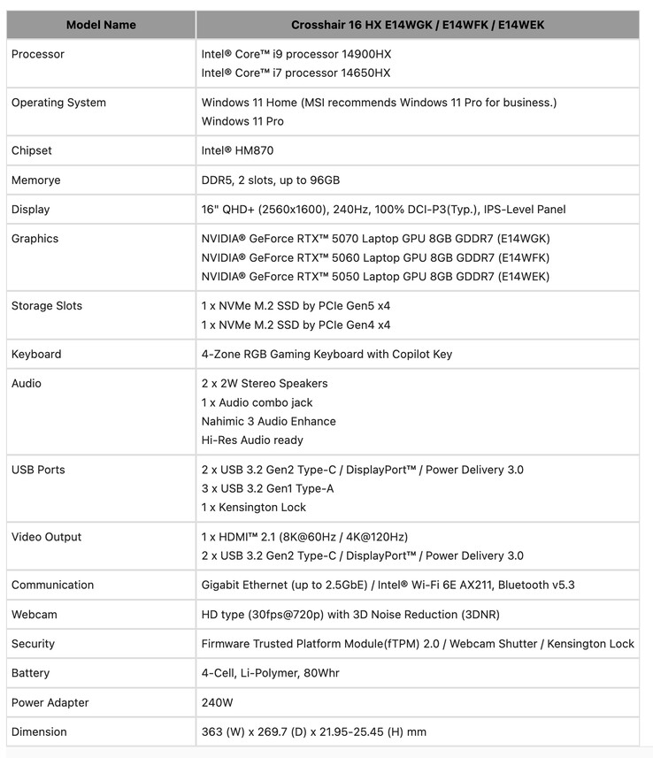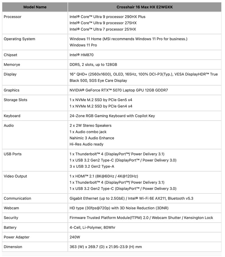 Кстати, Crosshair 16 Max HX E2WGXK - это первый ноутбук, для которого подтверждено, что он будет выпускаться с еще не представленным процессором Nvidia еще не представленным ноутбуком RTX 5070 с 12 ГБ GPU. Между тем, остальные семь ноутбуков, перечисленные выше, оснащены либо GeForce RTX 5070 Ti, GeForce RTX 5080 или GeForce RTX 5090.