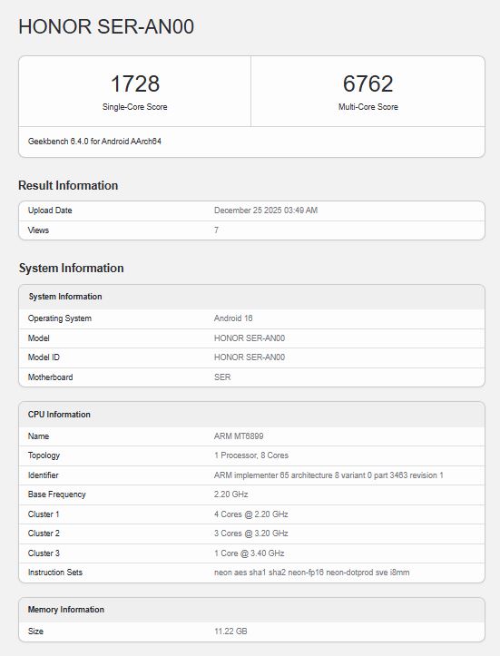 Протестированное устройство значится под идентификатором "Honor SER-AN00" и оснащено 12 ГБ оперативной памяти. С точки зрения производительности Dimensity 8500, похоже, не сильно превосходит Dimensity 8400. Чипсет показывает одноядерный результат 1 728 в лучшем случае, а многоядерный - 6 762. Для сравнения, Dimensity 8400 в тех же тестах набирает в среднем 1 621 и 6 208 баллов.
