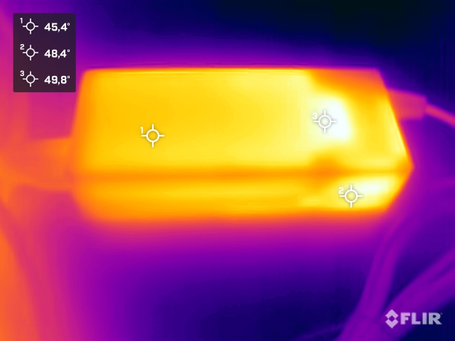 Под нагрузкой корпус GMKtec NucBox M6 Ultra заметно нагревается, но не достигает критических температур. В стресс-тесте температура AMD Ryzen 5 7640HS сначала поднимается до чуть более 86 °C, но затем стабилизируется на уровне около 80 °C. Энергопотребление остается неизменным на пределе 45 Вт.
