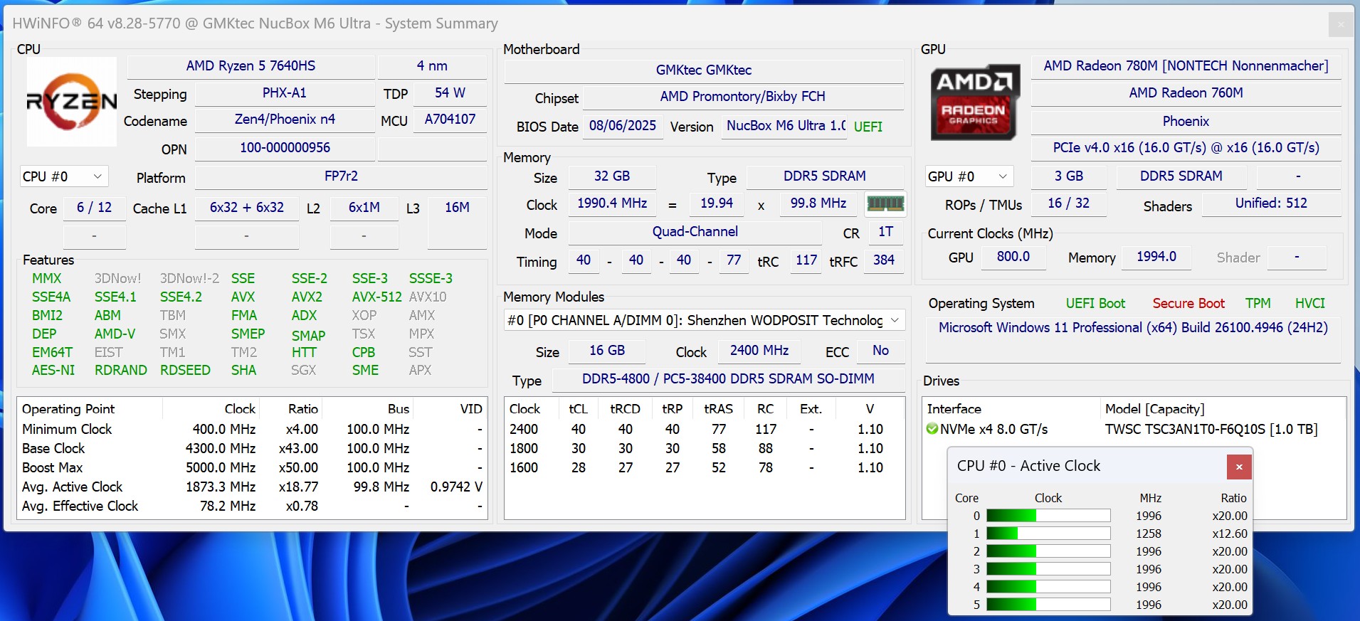 GMKtec NucBox M6 Ultra впечатляет как компактный мини-ПК с хорошей повседневной производительностью благодаря Ryzen 5 7640HS, оперативной памяти DDR5 и быстрому PCIe SSD. Его слабые места заключаются в охлаждении, которое становится слышным под нагрузкой, а управление вентиляторами все еще кажется незрелым. Однако при незначительных настройках BIOS NucBox M6 Ultra оказывается универсальным решением для офисных, мультимедийных и легких творческих задач.