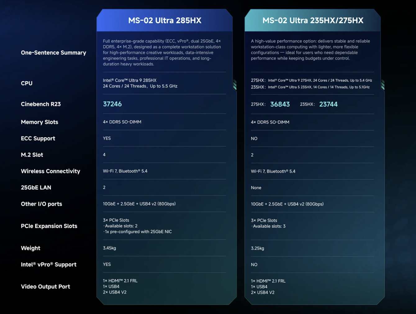 В настоящее время стоимость MS-02 Ultra начинается от $949 в базовой комплектации с Core Ultra 9 275HX до применения скидки в $50 при оформлении заказа по коду MS0250. Однако более дешевый Core Ultra 5 235HX будет доступен за $719. Между тем, модель Core Ultra 9 285HX начинается от $1 119 и возрастает до $2 899 с 192 ГБ оперативной памяти ECC и SSD на 2 ТБ. Обратите внимание, что только Core Ultra 9 285HX содержат два порта Ethernet 25 Гбит/с.