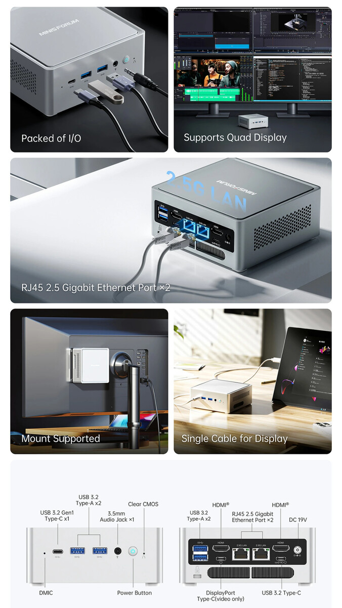 Более того, NAB3R поддерживает возможность модернизации накопителей и оперативной памяти, хотя в последнем случае только до 64 ГБ DDR4-3200. Тем не менее, компания Minisforum предусмотрела активное охлаждение для твердотельного накопителя M.2 2280 в мини-ПК, а также большой турбовентилятор на его нижней стороне. Как показано на изображении ниже, NAB3R также не обделен портами на задней стороне.
