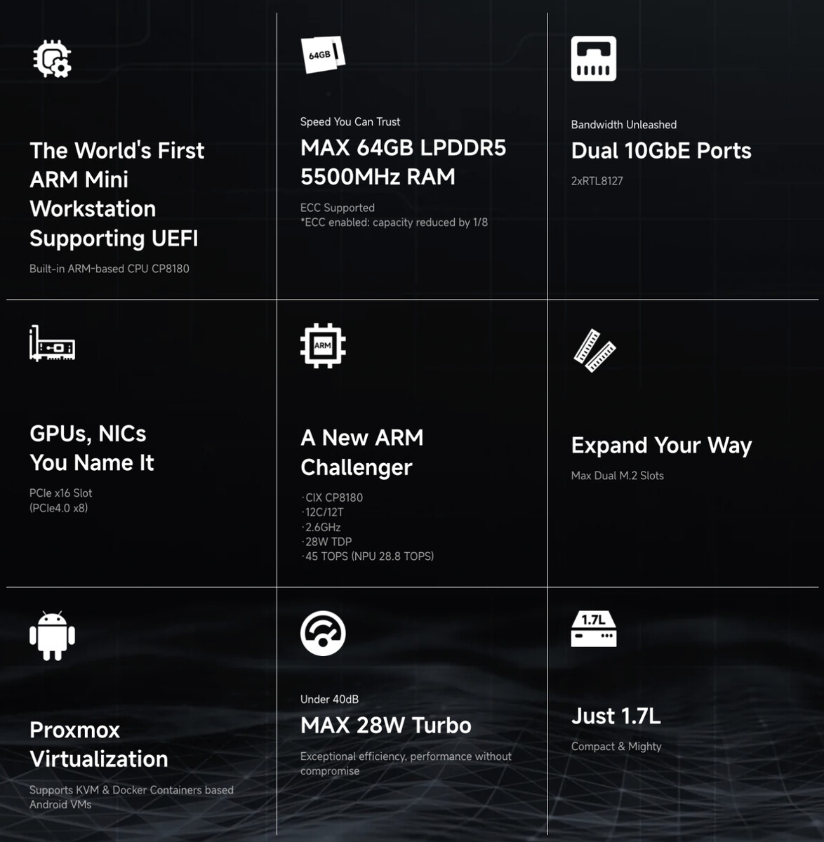 Описанный как новый "ARM-претендент" с "серьезной мощностью", MS-R1 внешне выглядит как обычный мини-ПК или мини-рабочая станция, с непритязательной внешностью и размером корпуса 1,7 литра. Однако в новом устройстве используется CIX CP8180, 12-ядерный и 12-поточный чипсет с TDP 28 Вт.