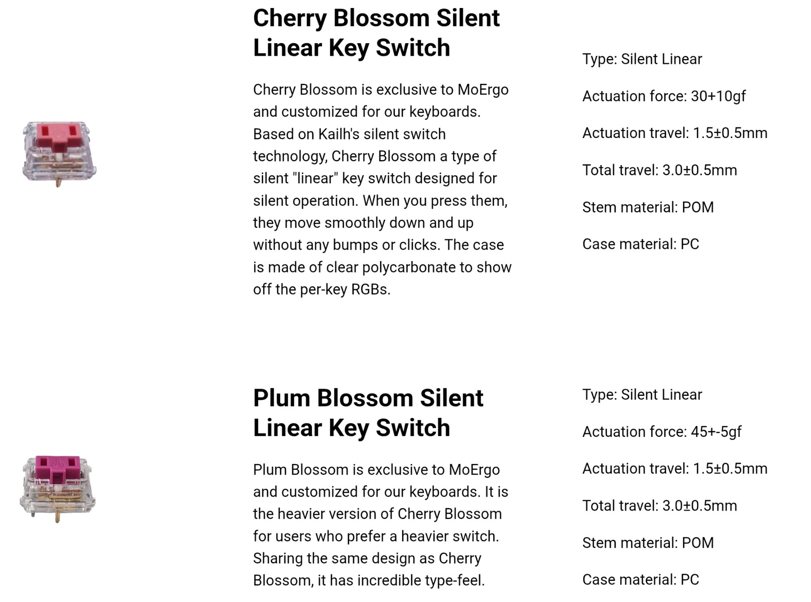 Для начала, новая клавиатура оснащена низкопрофильными переключателями Kailh Choc V1 с возможностью горячей замены, но на этот раз в комплект поставки входят бесшумные переключатели Cherry Blossom, которые являются эксклюзивными для MoErgo и конкретно для Go60. Как и оригинальная модель Glove80, Go60 оснащена колпачками из материала POM, что придает ей ощущение премиальности и улучшает химическую стойкость по сравнению с такими материалами, как ABS и даже PBT.