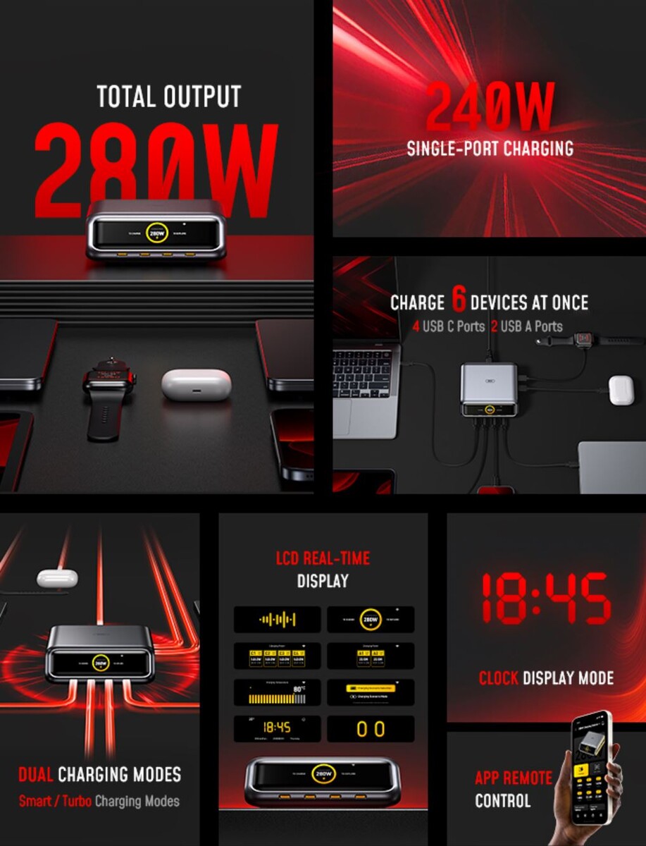 AOHi 280W GaN+ Desktop Charger - это настольная зарядная станция, способная питать различные устройства. Визуально она очень похожа на известные альтернативы от Anker и EcoFlow. Обладая мощностью до 280 Вт, эта новая модель находится как раз между ними. Питание осуществляется через шесть портов, в частности, четыре порта USB-C и два порта USB-A. Через один порт USB-C может подаваться до 240 Вт, что позволяет очень быстро заряжать даже такие мощные устройства, как ноутбуки и т.п.