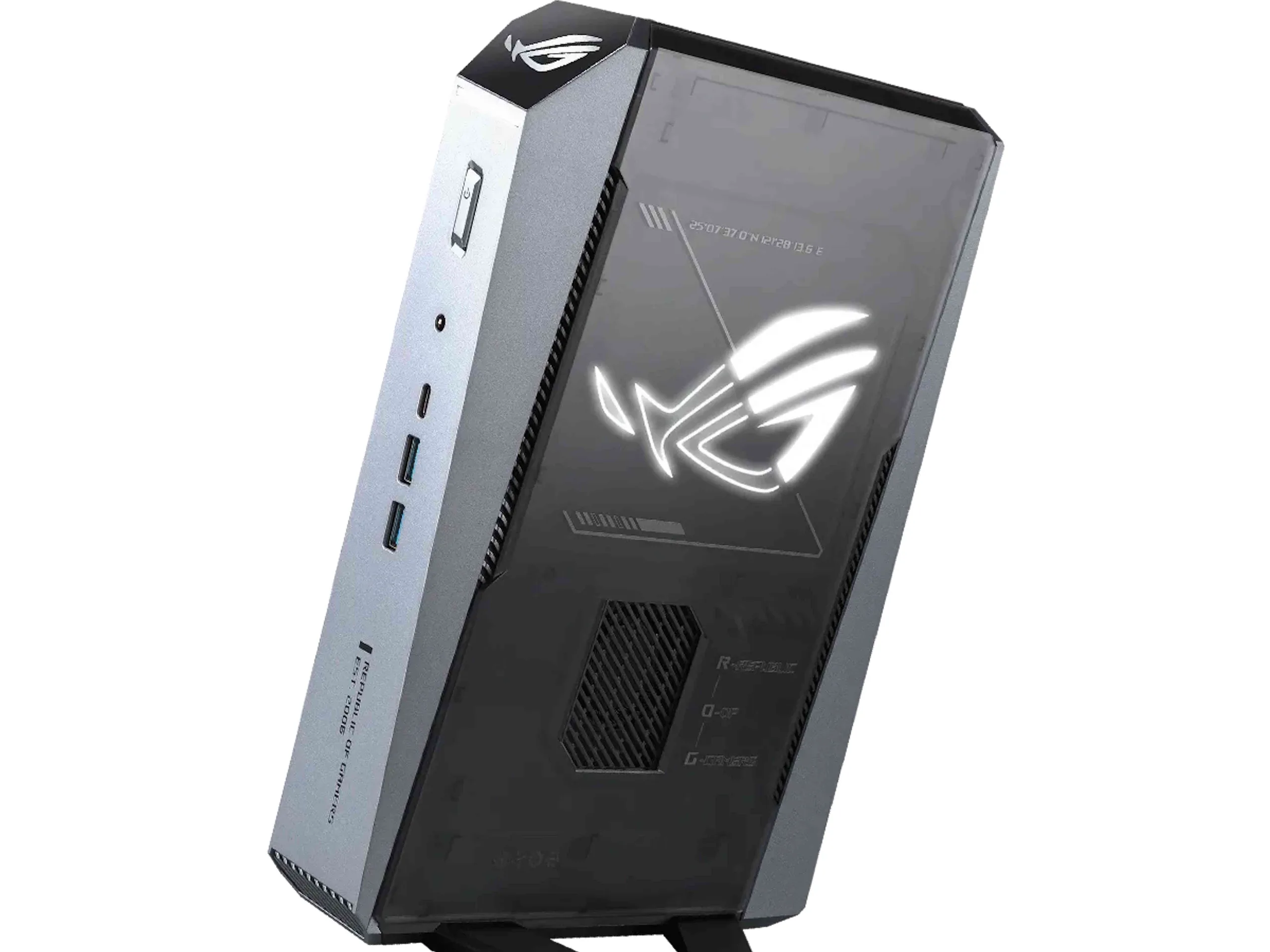 Asus ROG GR70 не совсем похож на модели производителя Модели NUCно его визуальный дизайн явно ориентирован на геймеров. Например, логотип ROG отчетливо виден в нескольких местах. Несмотря на компактные размеры всего 282,4 × 187,7 × 56,6 миллиметров, Asus устанавливает мощное сочетание AMD Ryzen 9 9955HX3D APU и выделенного Nvidia GeForce RTX 5070. Неудивительно, что Asus использует мобильную версию GPU, которая поставляется с 8 ГБ GDDR7 VRAM и потребляет до 100 Вт. При активации Dynamic Boost этот показатель увеличивается еще на 15 Вт.