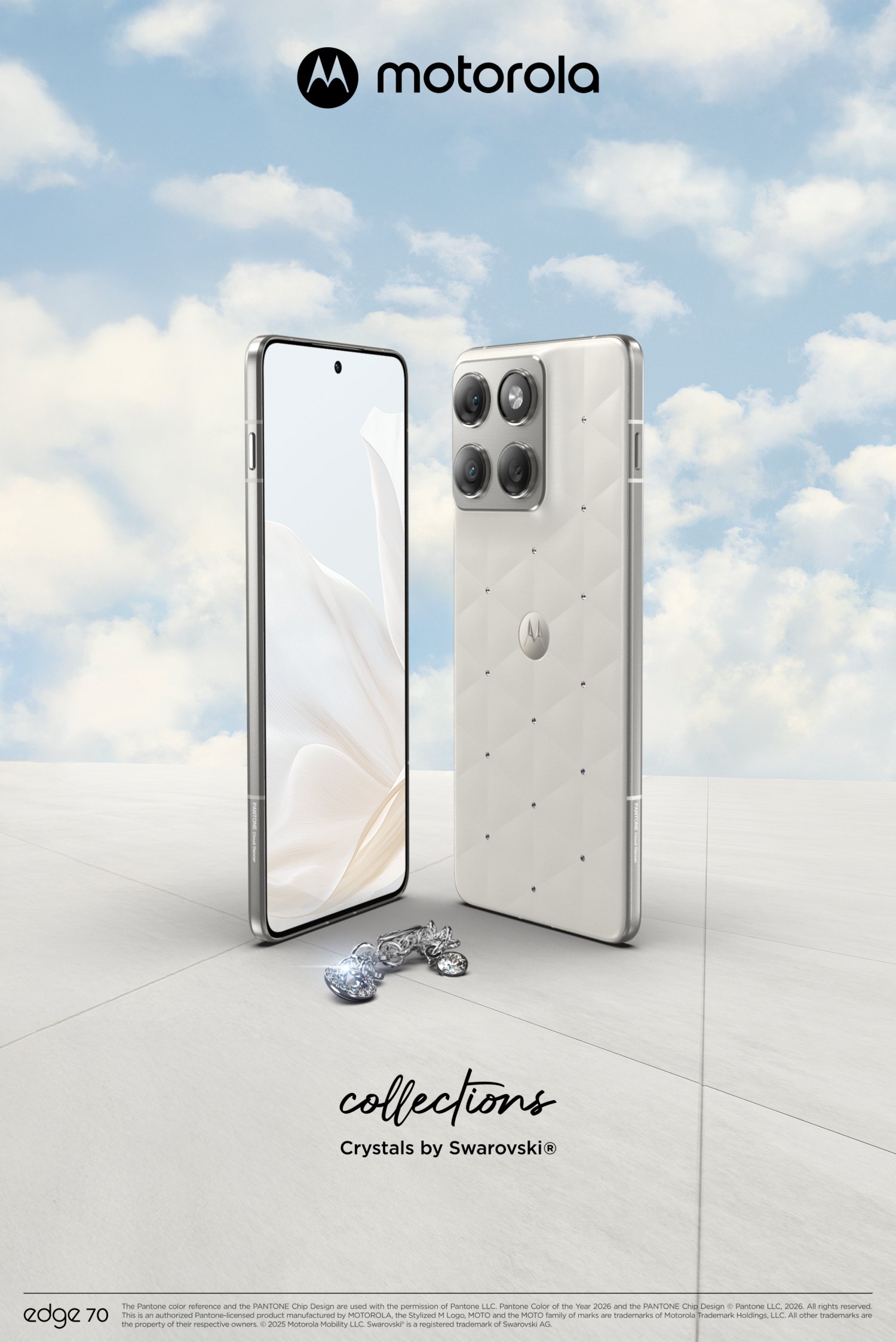 На прикрепленном изображении Motorola Edge 70 Swarovski Edition с задней стороны имеет белоснежную отделку, украшенную 14 кристаллами. Телефон также имеет серебристую рамку с надписью "PANTONE Cloud Dancer" на левой стороне.