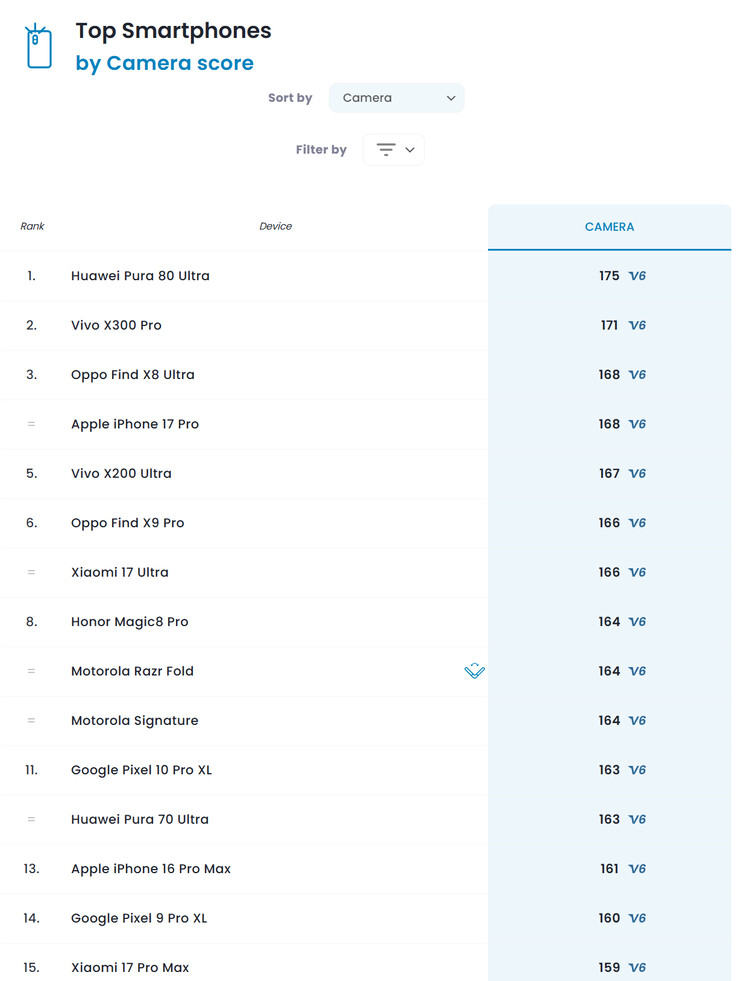 Как показано в таблице ниже, Razr Fold не дотягивает до таких современных флагманов, как iPhone 17 Pro, Find X9 Pro и Xiaomi 17 Ultra с результатом 164 балла. Между тем, модель Honor Magic V5 и Samsung Galaxy Z Fold7 находятся далеко внизу этого списка (по цене $1 809 на Amazon). Отчасти этому результату способствуют сильные телефото- и ультраширокоугольные камеры Razr Fold, которые часто уступают своим основным аналогам на раскладушках.