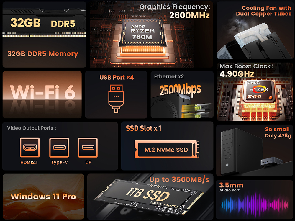 Компания N-one, не очень известный производитель, представила новый мини-ПК - NPC Pro+. Он работает на базе AMD Ryzen 7 8745HS, способного процессора из линейки Hawk Point. Благодаря Radeon 780M этот компактный ПК может запускать современные игры AAA на низких и средних визуальных настройках при разрешении 1080p.