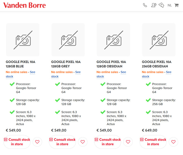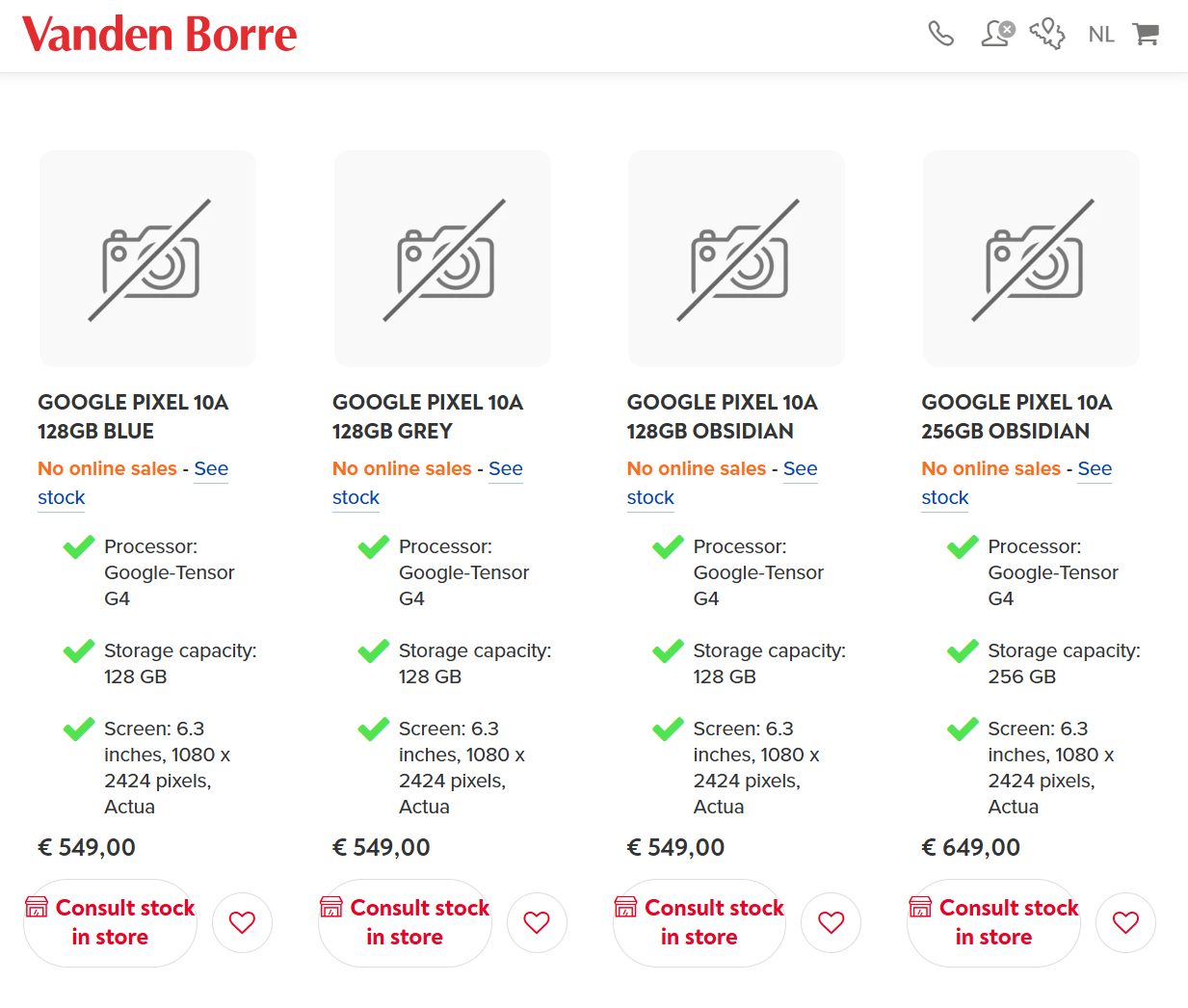 Но не только это, Ванден Борре также раскрыл цены на старте продаж. В настоящее время ритейлер планирует продавать Pixel 10a в синем, сером и обсидиановом цветах. Как показано на скриншоте ниже, Vanden Borre установил цену на эти цвета в €549 (~$650) при объеме памяти 128 ГБ. Розничный магазин подтверждает, что за 256 ГБ памяти Google возьмет €649 (~$769). Однако Pixel 10a должен быть доступен с 256 ГБ памяти не только в цвете Obsidian, показанном ниже.