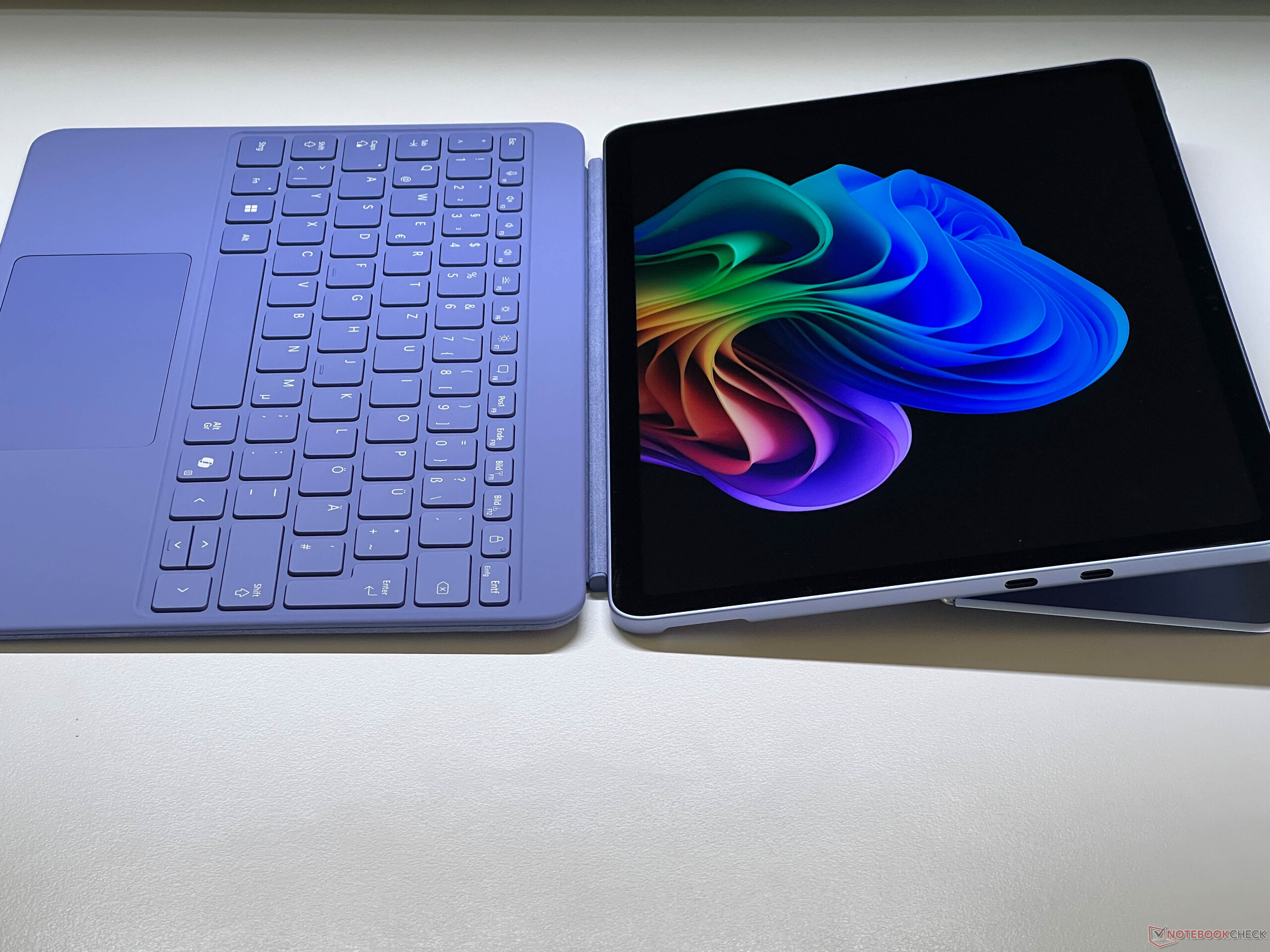 Корпус Surface Pro 12 выполнен из алюминия (доступен в фиолетовом, платиновом или океаническом цвете), на ощупь он очень премиальный, а качество сборки и устойчивость очень хорошие. Встроенный кикстенд прочен и обеспечивает максимальный угол раскрытия 165 градусов. Хотя в конфигурацию входит Wi-Fi 7 и достаточно высокая скорость передачи данных, два порта USB-C ограничены USB 3.2 Gen. 2, а коннектор Surface Connector также был удален. Здесь нет ни кардридера, ни возможности замены UFS-накопителя. Веб-камера 1080p (с функцией распознавания лиц) на передней панели не делает особенно хороших снимков; 10 МП камера на задней панели значительно лучше. Это устройство Copilot+. Сам по себе планшет весит 682 грамма (толщина 7,8 мм), а с прикрепленной крышкой-клавиатурой он весит 1 023 грамма (13 мм).