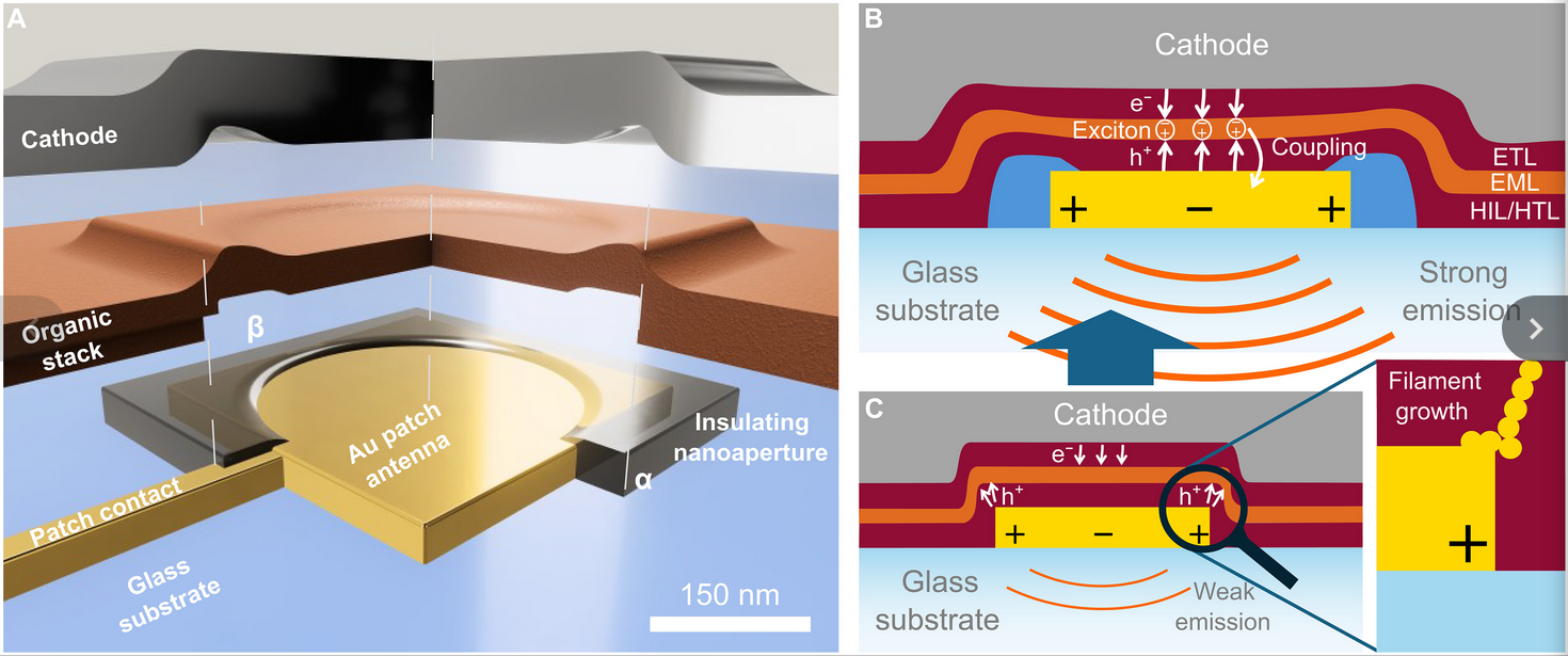 Немецкие исследователи опубликовали свои результаты в журнале Science Advances, где они отмечают, что пиксель размером 300 нм² излучает оранжевый свет и является таким же ярким, как и обычный OLED-дисплей размером 5 нм². Однако простое уменьшение светоизлучающего диода не позволило бы добиться надежной эффективности. Ученым потребовалось создать антенну в виде золотого кубоида размером 300 x 300 x 50 нм, а также убедиться, что токи электрического поля не заставят атомы золота разветвиться в оптически активном материале и в конечном итоге не приведут к короткому замыканию всей структуры пикселя. Для этого исследователи разработали изоляционный слой поверх антенны, который оставляет в центре антенны круглое отверстие диаметром 200 нм.
