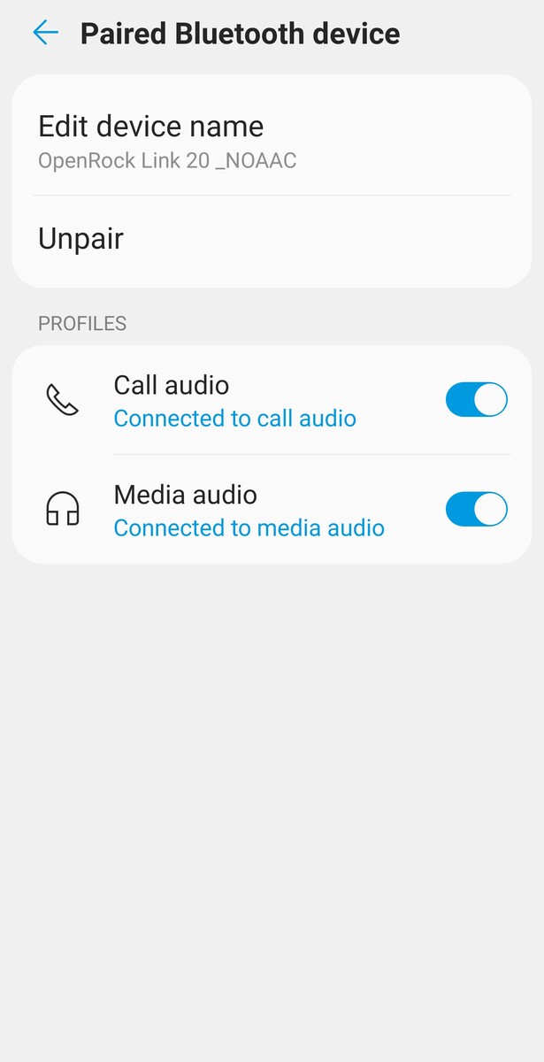 OpenRock Link 20 легко сопрягается с устройствами Bluetooth - включите его, дождитесь голосовой подсказки, затем найдите "OpenRock". Наушники подключаются в стандартном режиме кодека SBC или AAC, в зависимости от аудиоустройства. Хотя ни тот, ни другой не являются кодеками высокого разрешения, как LDAC, пользователи Android могут принудительно использовать SBC, добавив '_NOAAC' к имени устройства OpenRock в настройках Bluetooth-устройства.