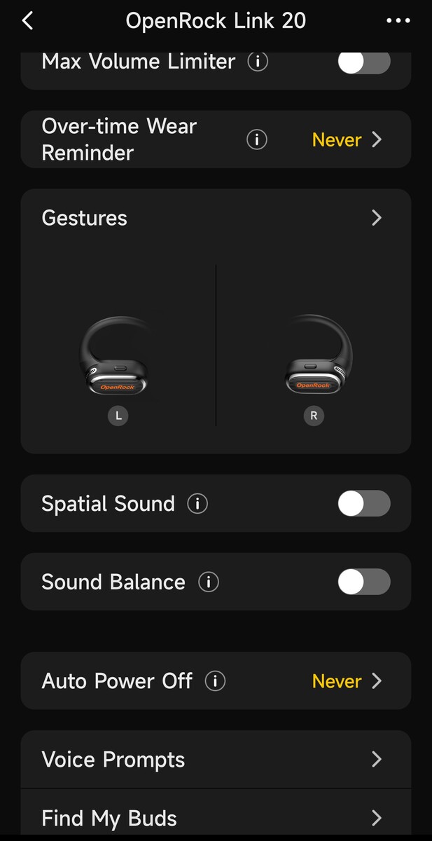 Приложение позволяет настроить эквалайзер (Музыка, Голос, Зверь или пользовательский 7-полосный эквалайзер), активировать пространственный звук, настроить звуковой баланс, установить таймеры автоотключения (15, 30 или 60 минут), установить напоминание о длительном ношении (30 минут, 1 час, 2 часа или 4 часа), ограничить максимальную громкость (80 дБ, 86 дБ или 92 дБ) и установить язык голосовых подсказок на английский или китайский. Приложение также может воспроизводить непрерывный высокий звук через наушники, чтобы помочь их найти.