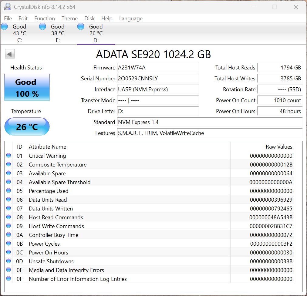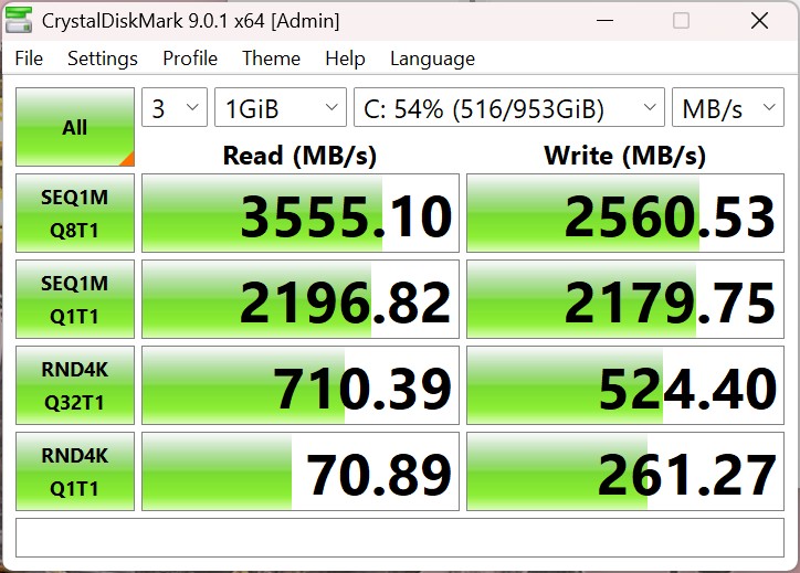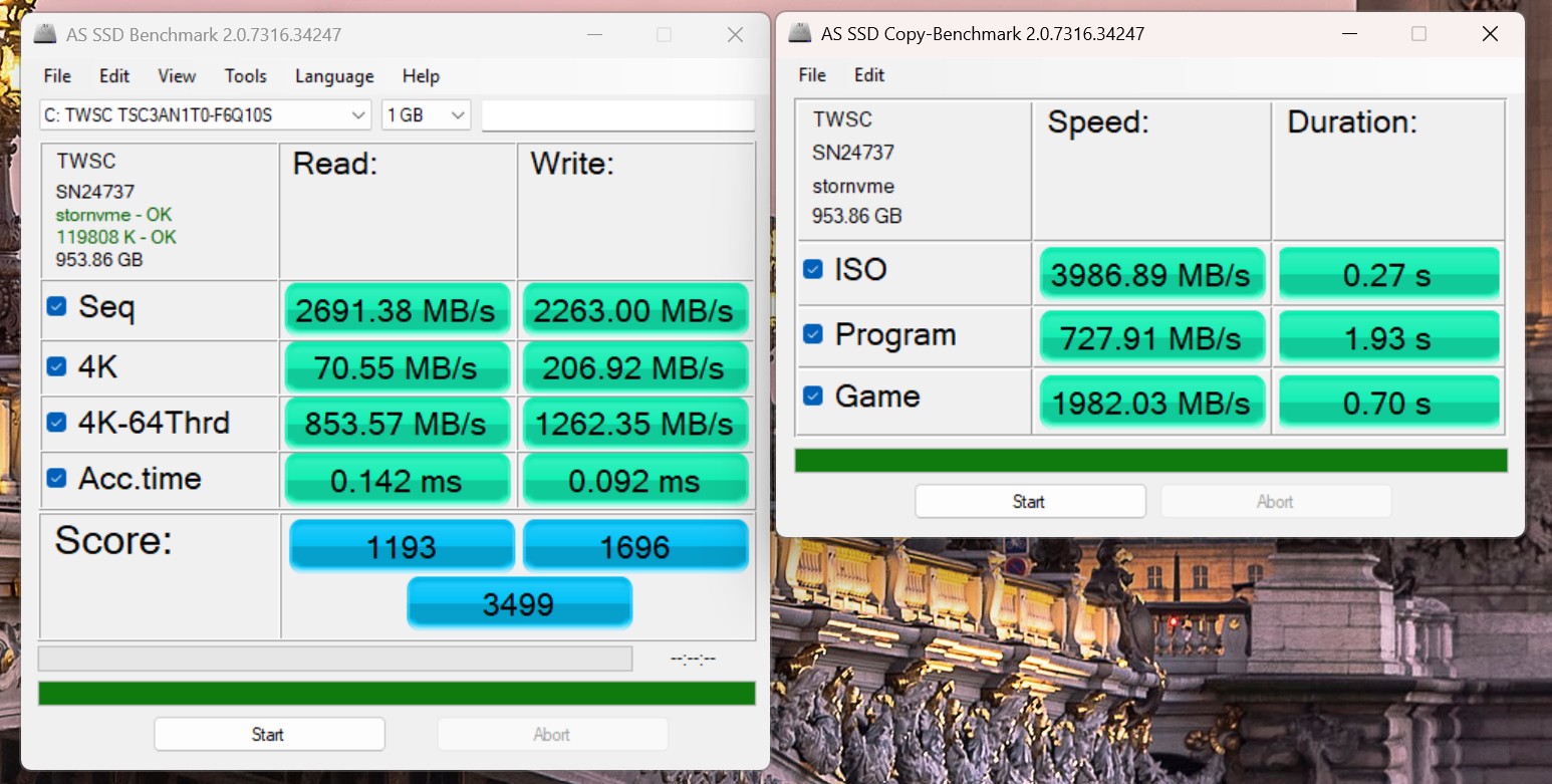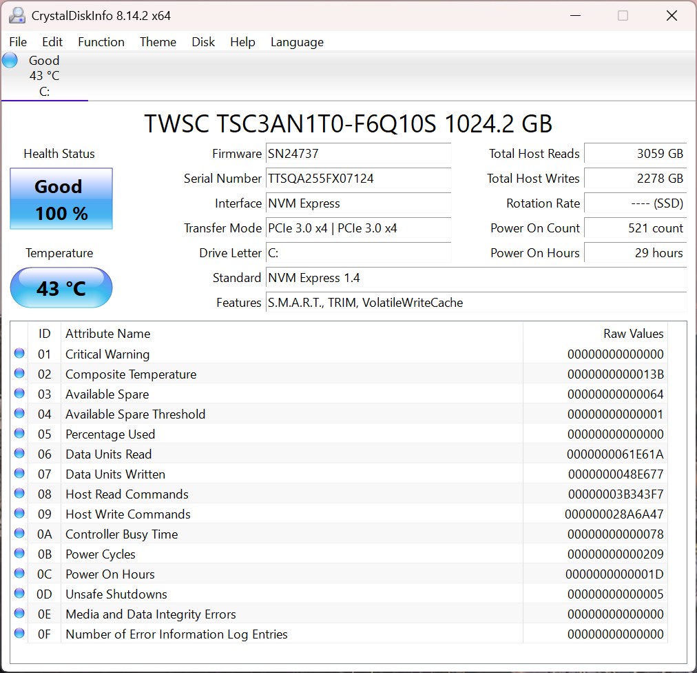 В GMKtec NucBox M3 Ultra установлен твердотельный накопитель объемом 1 ТБ от TWSC. Устройство хранения данных использует интерфейс PCIe 3.0 x4 и обеспечивает высокую скорость передачи данных, вполне достаточную для повседневного использования. Активный блок охлаждения отсутствует, а значит, производительность немного падает при длительной нагрузке. Также имеется второй слот M.2-2280 для установки дополнительного SSD.