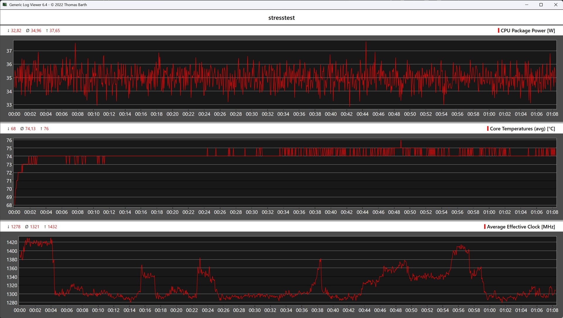 Под нагрузкой корпус GMKtec NucBox M3 Ultra заметно нагревается и достигает пикового значения почти 50 C на нижней стороне. В стресс-тесте температура Intel Core i7-12700H сначала поднимается примерно до 76 C, а затем стабилизируется на уровне 74 C. Энергопотребление SoC немного колеблется между 33 и 37 Вт, хотя в среднем достигает 35 Вт.