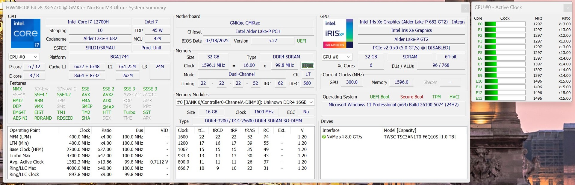 GMKtec NucBox M3 Ultra сочетает в себе высокую вычислительную мощность и ультракомпактный форм-фактор. Внутри находится Intel Core i7-12700H, 14-ядерный процессор с тактовой частотой до 4,7 ГГц, поддерживаемый интегрированной графикой Intel Iris Xe Graphics. Несмотря на свои небольшие размеры, мини-ПК предлагает место для установки до 64 ГБ оперативной памяти DDR4 и до 8 ТБ SSD-накопителя. Мы тестируем модель с 32 ГБ ОЗУ и 1 ТБ SSD, которая в настоящее время доступна по цене около $429.