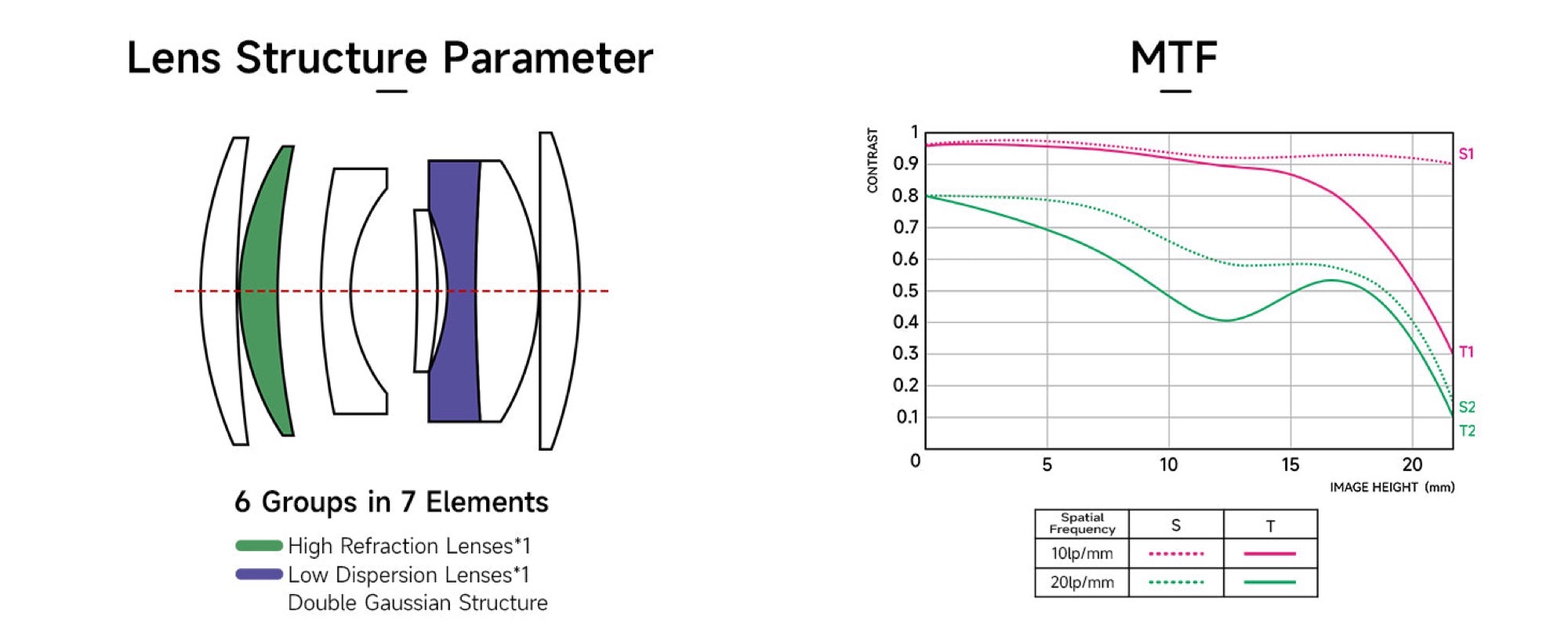 Чтобы сделать возможным низкий ценник, Brightin Star выбрал относительно простую конструкцию объектива с 7 элементами в 6 группах и полностью отказался от асферических линз или линз с апохроматической коррекцией. Как видно из кривых MTF, представленных производителем, объектив передает очень мало деталей по краям кадра при максимальной диафрагме. Объектив резкий только в центре изображения, что должно сделать его подходящим для портретов, среди прочих сценариев.