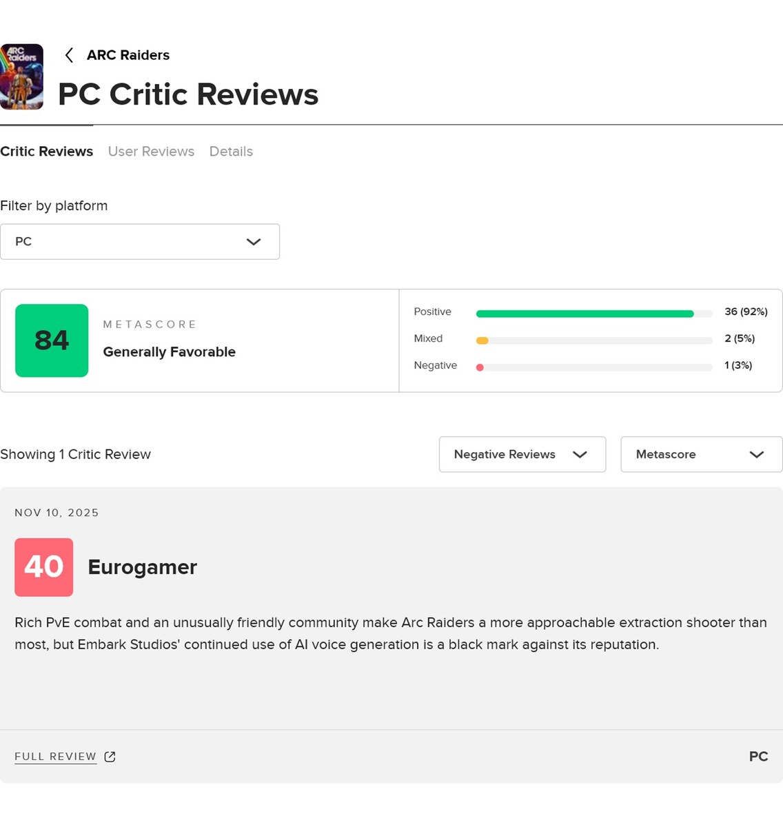 Экстракционный шутер от Embark Studios Arc Raiders превзошел ожидания по количество игроков. Мнения СМИ также положительные, рейтинг 84 на Metacritic. Однако одна оценка бросается в глаза - это единственный отрицательный обзор Arc Raiders на агрегаторе. Eurogamer поставил игре оценку 2/5, в основном из-за того, что в ней использования генеративного ИИ.