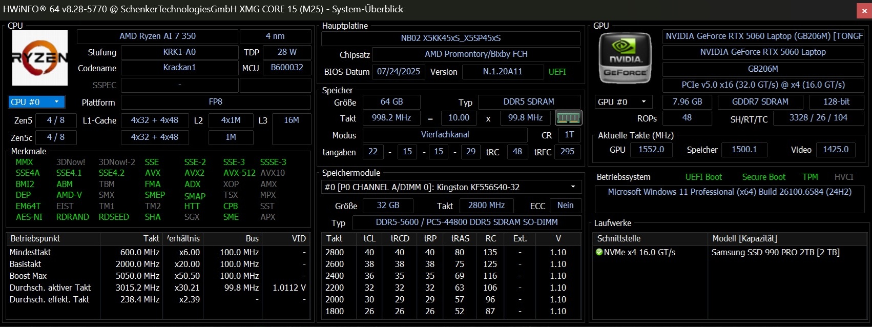 SCHENKER XMG Core 15 (M25) AMD Ryzen AI 7 350 ⎘ Nvidia GeForce RTX 5060 Laptop ⎘ 64 Гбайт ОЗУ, 2048 Гбайт SSD | Прейскурантная цена: 1840 EUR | 1.9 килог. | 22 мм | 15.30" 2560x1600 197 PPI IPS | |