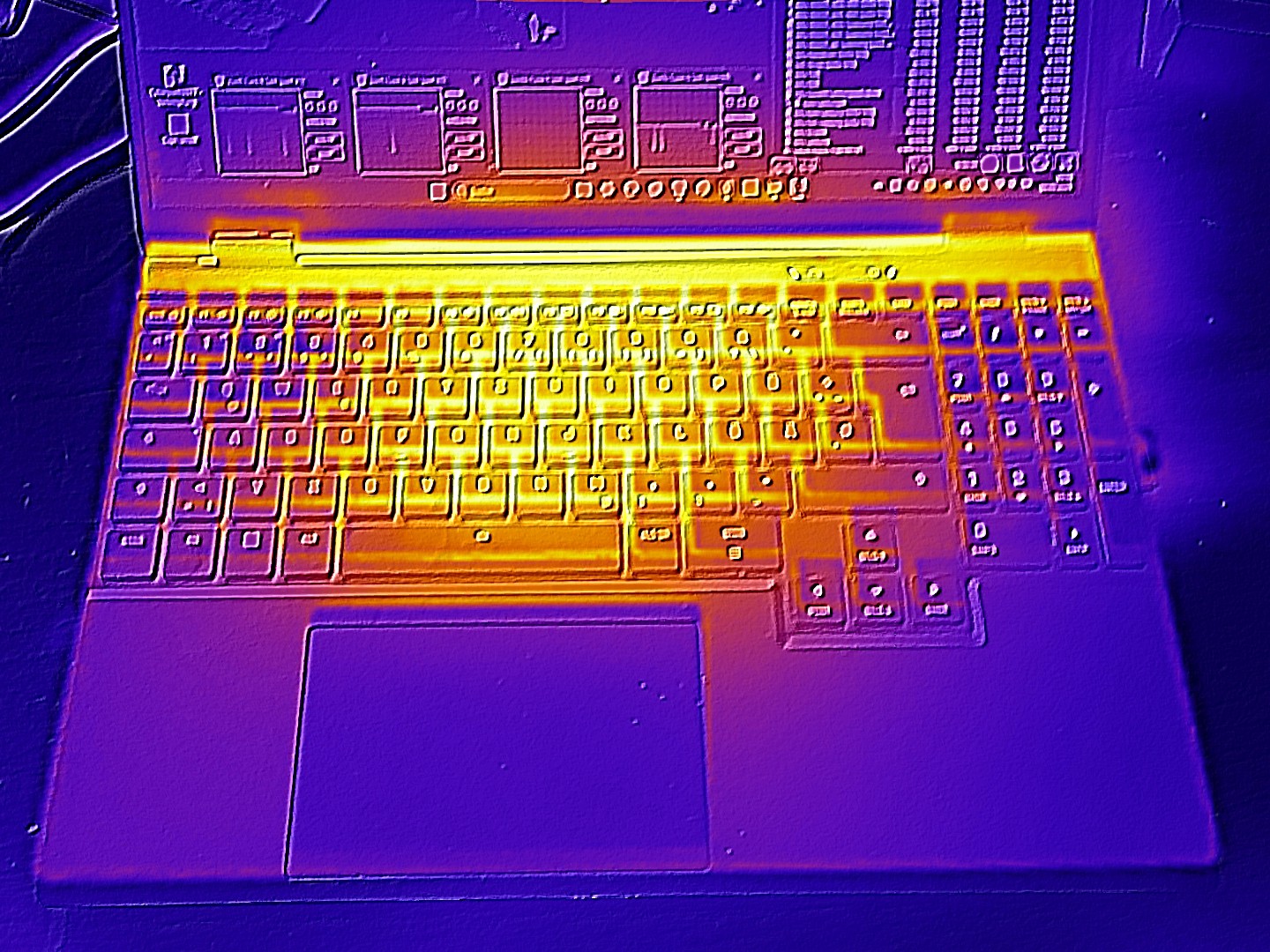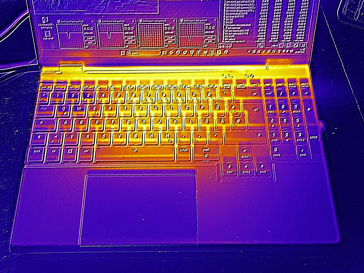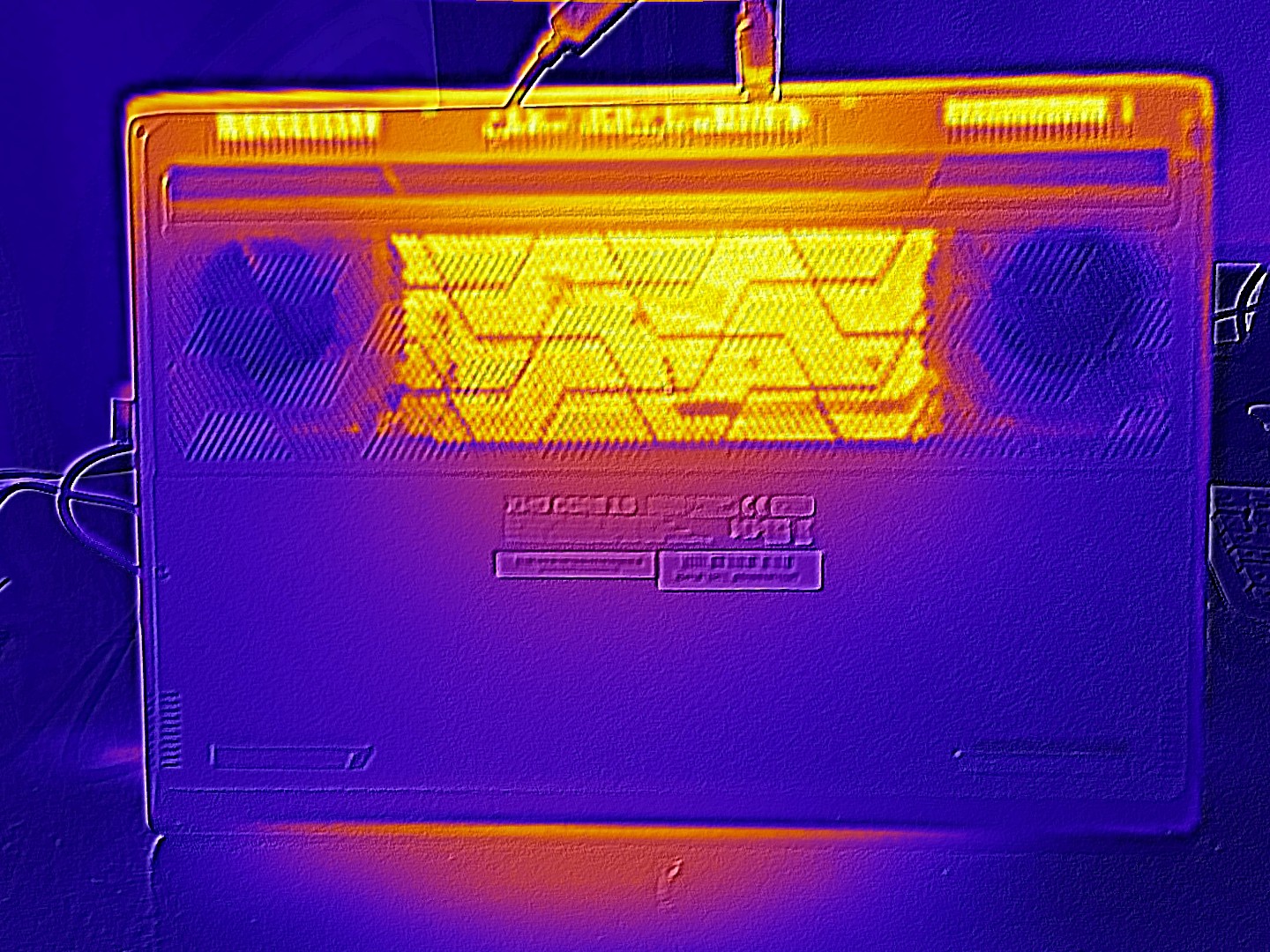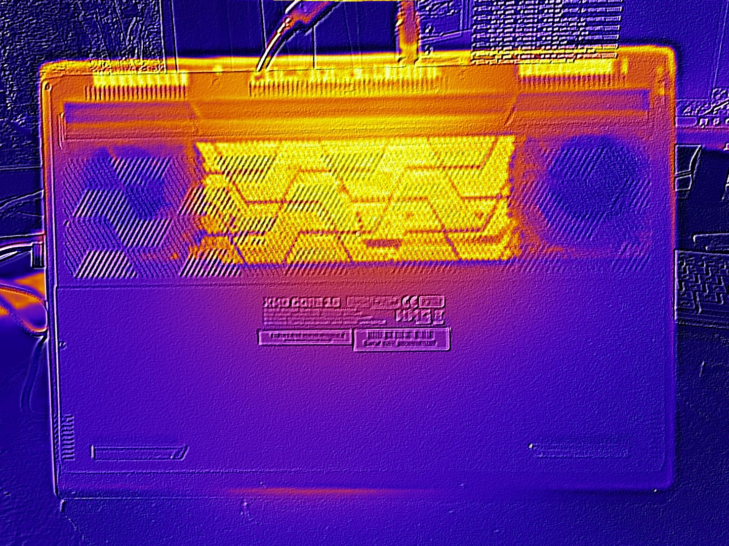 Температурные результаты неоднозначны. В то время как в режиме ожидания температура корпуса в основном не превышает 30 °C, под нагрузкой температура поверхности поднимается почти до 50 °C сверху и 60 °C снизу. Эти показатели схожи с Lenovo LOQ 15, в то время как Legion 5 работает холоднее.