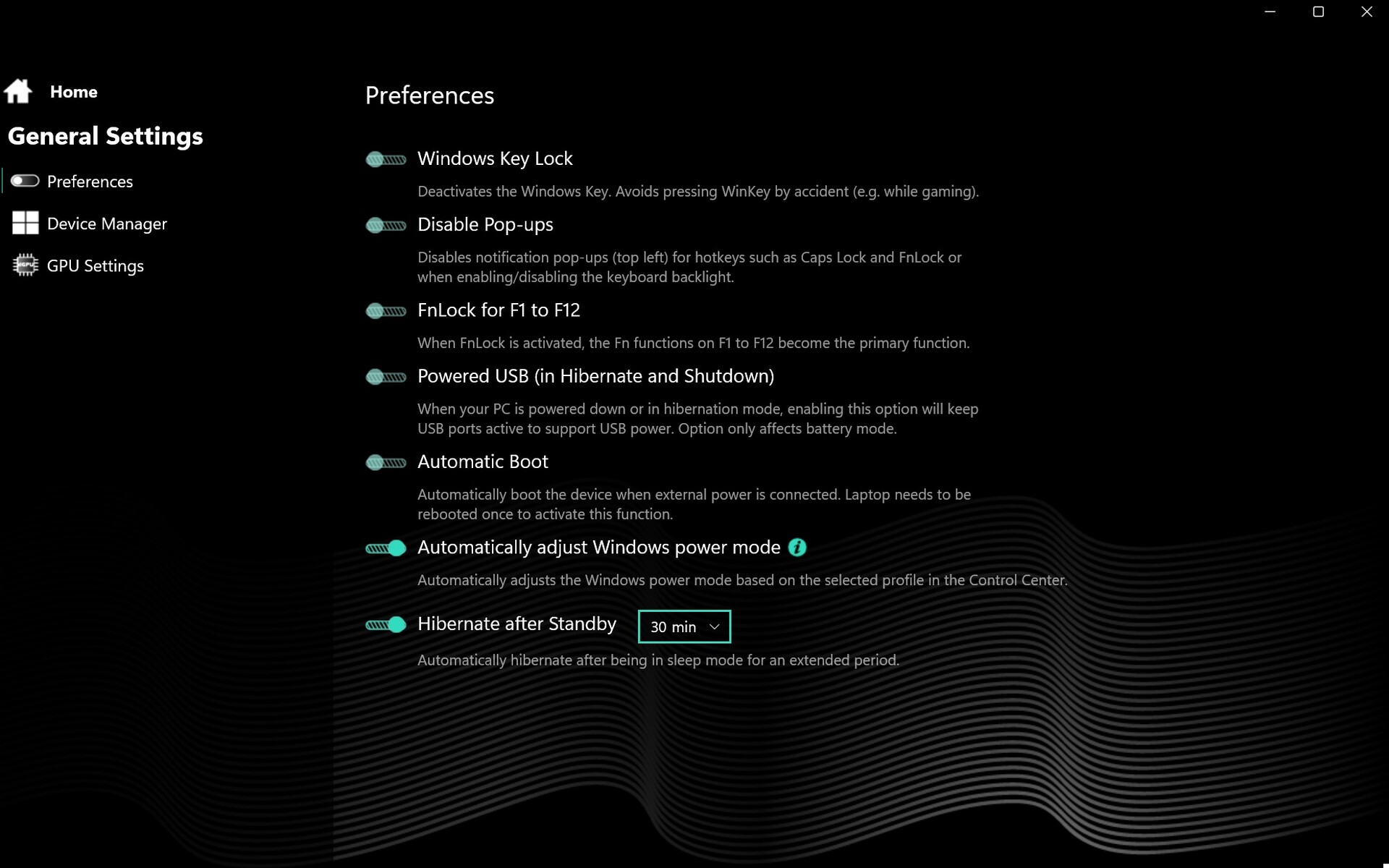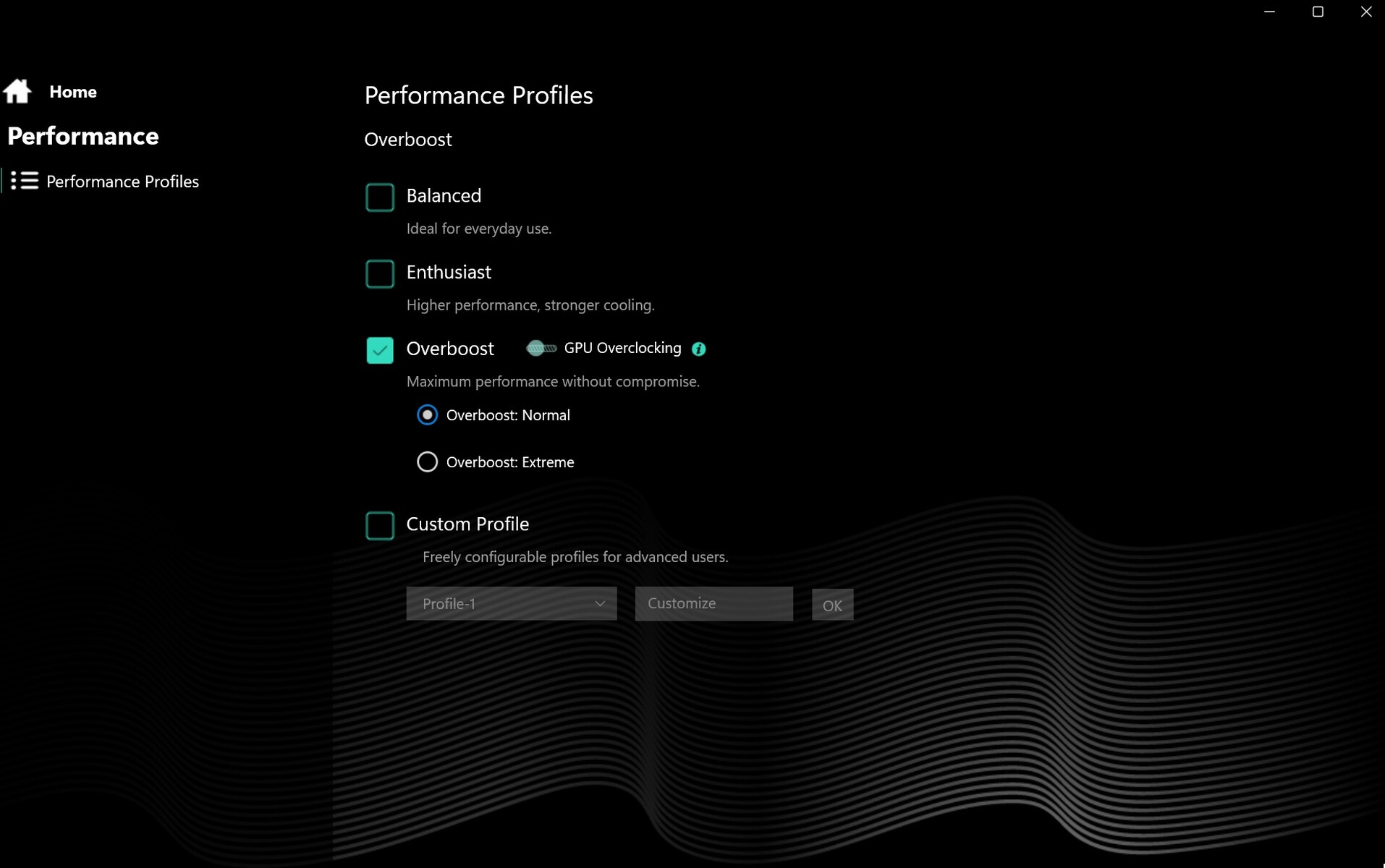 Предустановленный Центр управления предлагает множество функций и настроек. Геймеров больше всего заинтересует меню производительности, в котором представлены три профиля (см. таблицу). За исключением теста батареи, все измерения проводились в режиме Overboost с отключенным разгоном GPU. При желании можно создать собственный профиль.