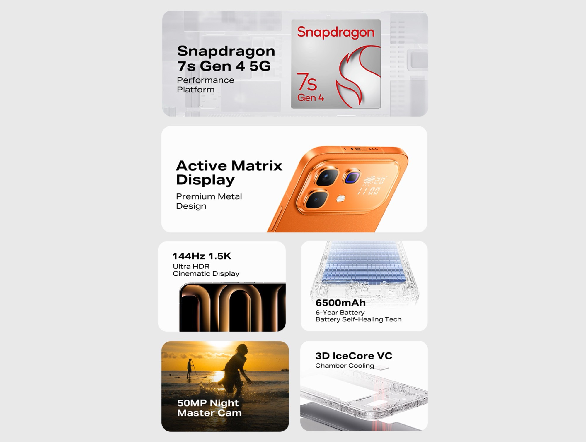 На рамке видна кнопка спуска затвора камеры, сильно напоминающая сенсорную кнопку Capture Button на iPhone 17, хотя подробности о ее функциональности пока неизвестны. Infinix Note 60 Pro работает на базе процессора Qualcomm Snapdragon 7s Gen 4который оснащен четырьмя производительными ядрами ARM Cortex-A720 и четырьмя производительными ядрами Cortex-A520.