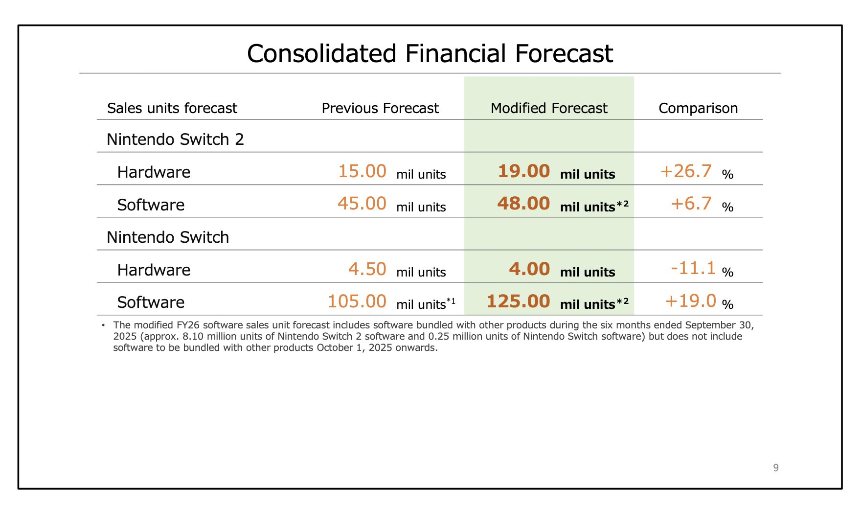 На данном этапе Nintendo ожидает, что Switch 2 будет пользоваться большей популярностью, чем Switch в первый год своего существования, который за этот период достиг 14,86 млн. единиц. Неудивительно, что продажи последней продолжают падать: Nintendo зафиксировала снижение на 60% по сравнению с прошлым годом, до 1,89 млн. единиц. В связи с этим Nintendo сократила свой прогноз по аппаратному обеспечению для старой модели до 4 миллионов единиц, хотя прогнозы по программному обеспечению были пересмотрены в сторону увеличения со 105 миллионов до 125 миллионов, чему, вероятно, способствовала обратная совместимость с играми Switch 2 и то, что Mario Kart World уже отгружена в количестве 9,57 миллиона единиц.