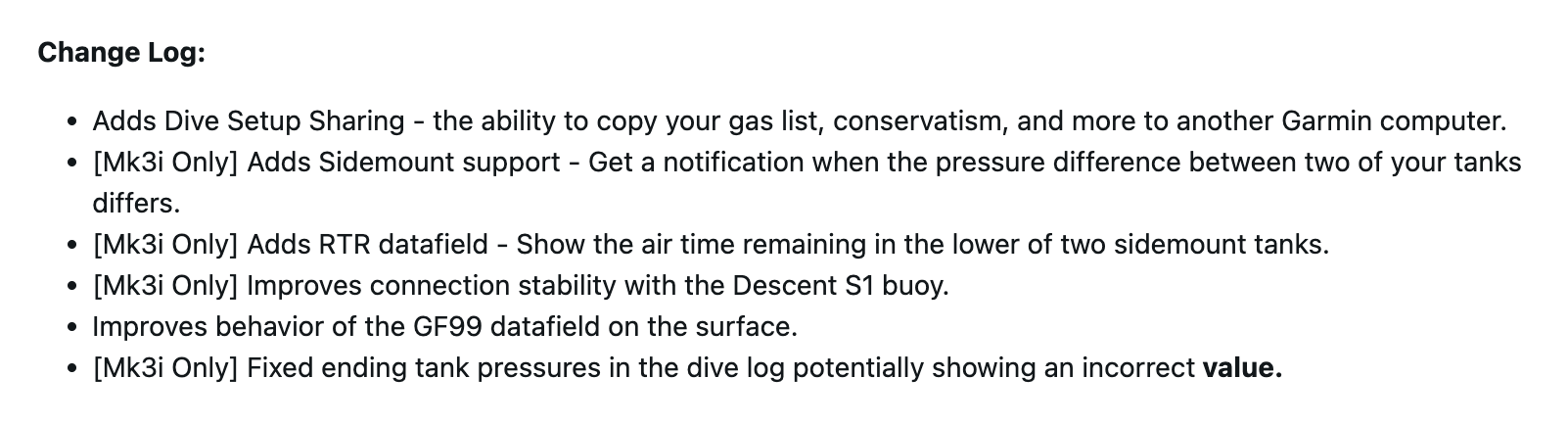 Смарт-часы Garmin Descent Mk3 и Mk3i получили новую функцию Dive Setup Sharing в версии 25.21. Она позволяет пользователям копировать такую информацию, как список заправок и консерватизм, на другое устройство Garmin. Оба гаджета также получили улучшение данных о коэффициенте уклона 99% (GF99), отображаемых на поверхности.