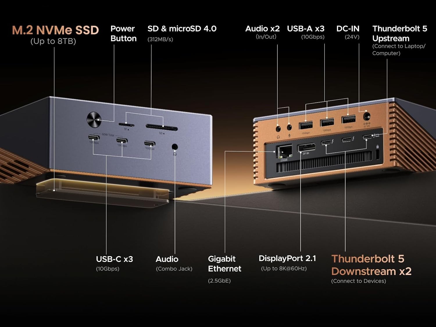 Построенная на базе Thunderbolt 5 с производительностью 120 Гбит/с, Maxidok 17-in-1 предоставляет в общей сложности 17 высокоскоростных портов, включая три порта Thunderbolt 5, и два порта для настольных аксессуаров. На передней панели док-станции расположены три порта USB-C 10 Гбит/с, слоты для карт памяти SD и microSD 4.0, а также комбинированный аудиоразъем 3,5 мм. Сзади расположены порты Thunderbolt 5, а также три порта USB-A 10 Гбит/с, выход DisplayPort 2.1, разъем Ethernet 2,5 GbE, а также специальные порты аудиовхода и выхода.