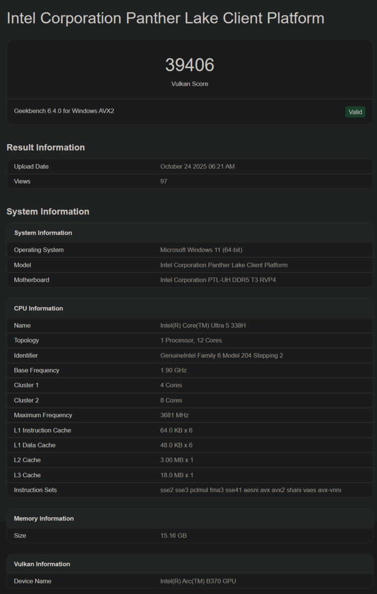 Core Ultra 5 338H появился на сайте Geekbench с никогда ранее не встречавшимся iGPU: Arc B370. Его название немного не соответствует действительности, поскольку буква B означает, что он основан на архитектуре Xe2 Battlemage, а не Xe3 Alchemist. Или же это, скорее всего, случай, когда Geekbench неправильно идентифицирует GPU в том, что явно является предсерийным ноутбуком