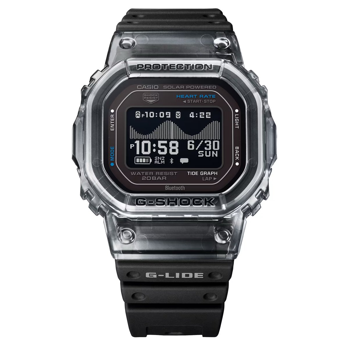 Сочетание эстетики, располагающей к серфингу, и полноценного Фитнес-трекинг G-Squad эти часы с квадратным лицом в значительной степени заимствованы у популярной модели GBX-100. Черная GBX-H5600-1 и синяя GBX-H5600-2 имеют освежающий полупрозрачный дизайн, который идеально передает летние пляжные вибрации, и могут похвастаться высококонтрастным MIP ЖК-дисплеем высокой четкости, который делает проверку уведомлений и графиков приливов легким делом даже при прямом солнечном свете. Оба устройства выполнены из экологически чистого биомассового пластика и весят всего 47 грамм.