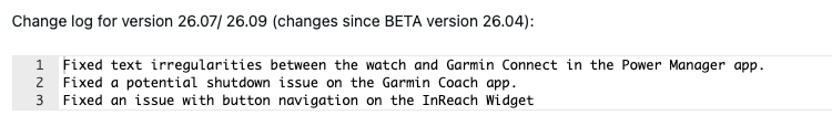 В остальном журнал изменений для бета-версии Fenix 7 26.09 практически идентичен. В нем перечислены три исправления ошибок, одно из которых устраняет проблему с приложением Power Manager, когда текст на часах не совпадал с текстом, отображаемым в приложении Garmin Connect. Устранена проблема, которая могла привести к отключению этих смарт-часов при использовании приложения Garmin Coach, а также исправлены несоответствия текста на часах и Garmin Connect в приложении Power Manager. Кроме того, как сообщается, исправлена ошибка, связанная с навигацией по кнопкам для виджета InReach Widget.