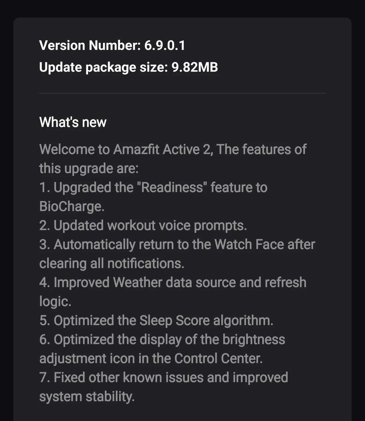 Более старое версия программного обеспечения 6.7.0.1выпущенная в декабре 2025 года, по слухам, принесла в смарт-часы Active 2 инструмент мониторинга уровня энергии BioCharge. Однако некоторые пользователи более ранних моделей этих носимых устройств сообщили, что не могут получить доступ к этой функции. Теперь, в версии 6.9.0.1, функция BioCharge доступна для всех пользователей, включая тех, у кого смарт-часы имеют 32 МБ памяти PSRAM.