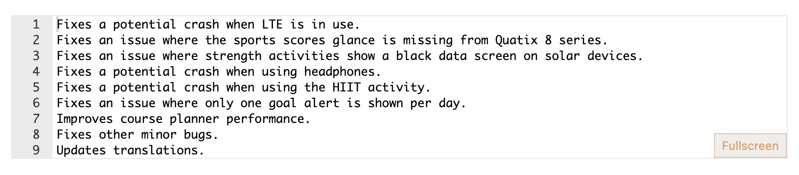 Garmin также перечисляет улучшения в работе функции Планировщика курса, хотя неясно, отличаются ли они от улучшений, перечисленных в предыдущих бета-версиях. Кроме того, в примечаниях к выпуску упоминаются исправления ошибок, связанных с просмотром спортивных результатов, силовыми упражнениями и активностью HIIT. Ниже Вы можете найти скриншот примечаний к выпуску.