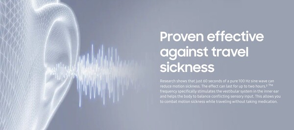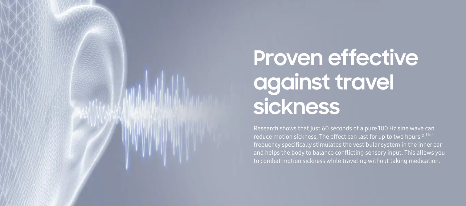 Samsung называет новое приложение Hearapy и говорит, что оно призвано помочь уменьшить укачивание. Для этого оно воспроизводит басовый синусоидальный тон частотой 100 Гц, который стимулирует систему равновесия пользователя, тем самым уменьшая укачивание без необходимости принимать лекарства.
