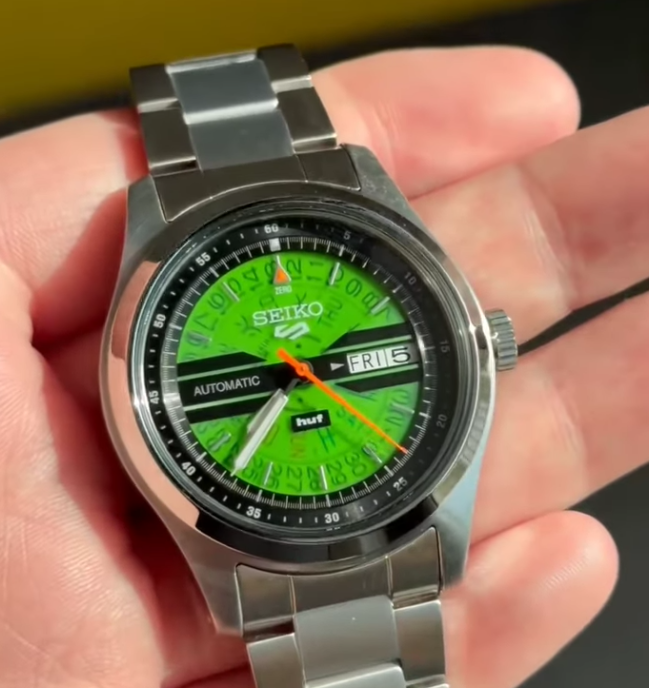 Недавно замеченные практические изображения, благодаря @SeikoLeaks на YouTubeдают нам возможность на практике увидеть, как ацетатный циферблат "HUF Green" взаимодействует со светом. Как и ожидалось, он обладает высокой степенью прозрачности, обнажающей механические колеса дня недели и даты под поверхностью. Исполнение циферблата, вдохновленное "Time Sonar" 1970-х годов, создает многослойный, трехмерный эффект, который обычно не встречается в линейке Seiko 5 начального уровня. В то время как рекламные рендеры часто обеззараживают эти текстуры, реальные снимки демонстрируют уникальный индустриальный характер: черная горизонтальная полоса "Automatic" и логотип "huf" в положении "6 часов" кажутся парящими над зеленым диском.