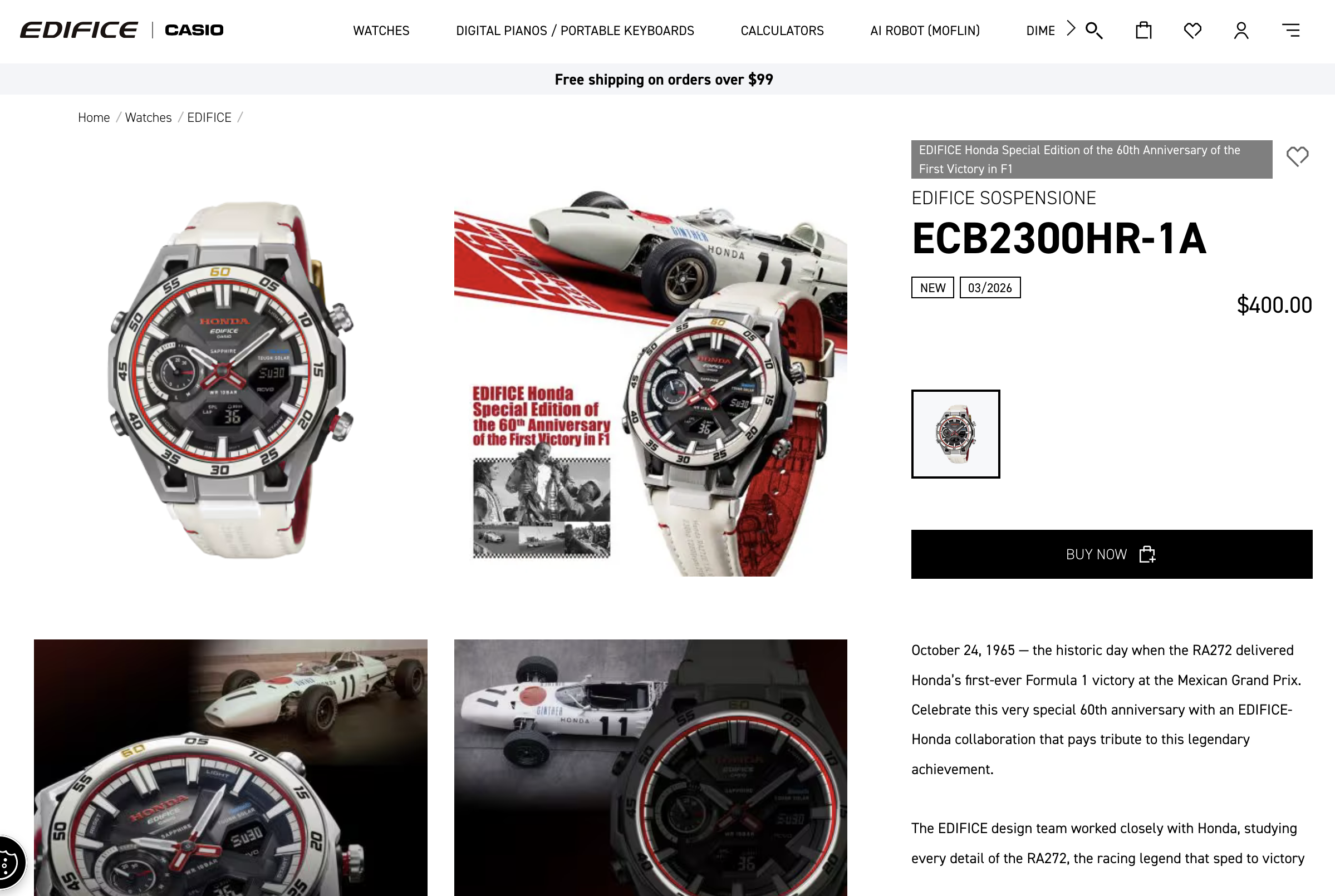 Модель основана на платформе Edifice Sospensione и имеет множество дизайнерских решений, вдохновленных гоночным автомобилем Honda RA272. Белый кожаный ремешок с красной подкладкой напоминает гоночную ливрею Honda, а циферблат украшен красными акцентами и брендингом Honda. Корпус часов имеет размеры 50,2 × 45,8 × 11,8 мм и весит 67 г.