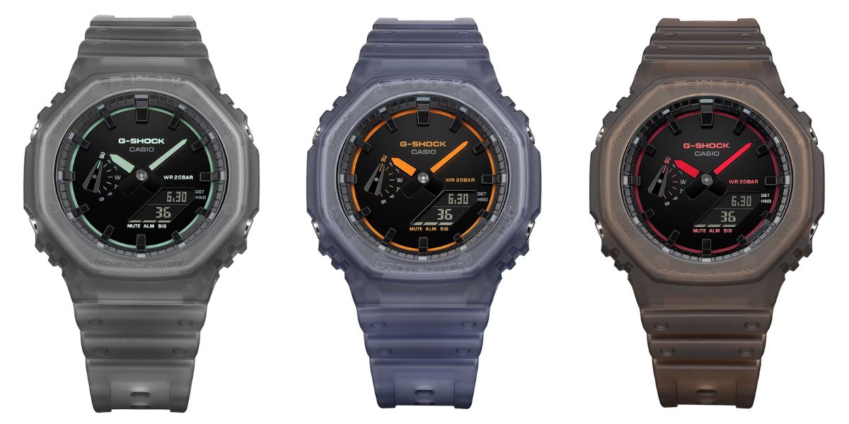 Часы G-Shock GA-2100K от Casio вдохновлены ночными клубами и музыкальными фестивалями: корпус и ремешок из прозрачной смолы имеют дымчатую отделку. Кроме того, неоновые акценты символизируют лазерную подсветку, часто используемую в подобных заведениях. Модель GA-2100K-1A - серая с бирюзовыми акцентами, GA-2100K-2A - синяя с оранжевыми акцентами, а GA-2100K-5A - коричнево-оранжевая с красными акцентами.